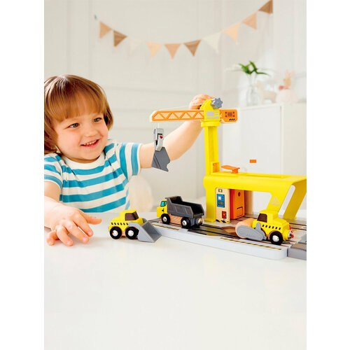 • Комплектация: крановая установка, грузовик, 2 дорожных ремонтных автомобиля, 2 конуса безопасности, 4 элемента разрушенной дороги, дорожный знак, 3 коротких пластиковых участка пути. • Материалы: дерево (бук, фанера, МДФ), пластик (ABS, полипропилен), текстиль (полиэстер), металл (нержавеющая сталь, магнит) • Размеры в собранном виде: 36 х 19 х 23 см. • Возрастные рекомендации: для детей от 3 лет.