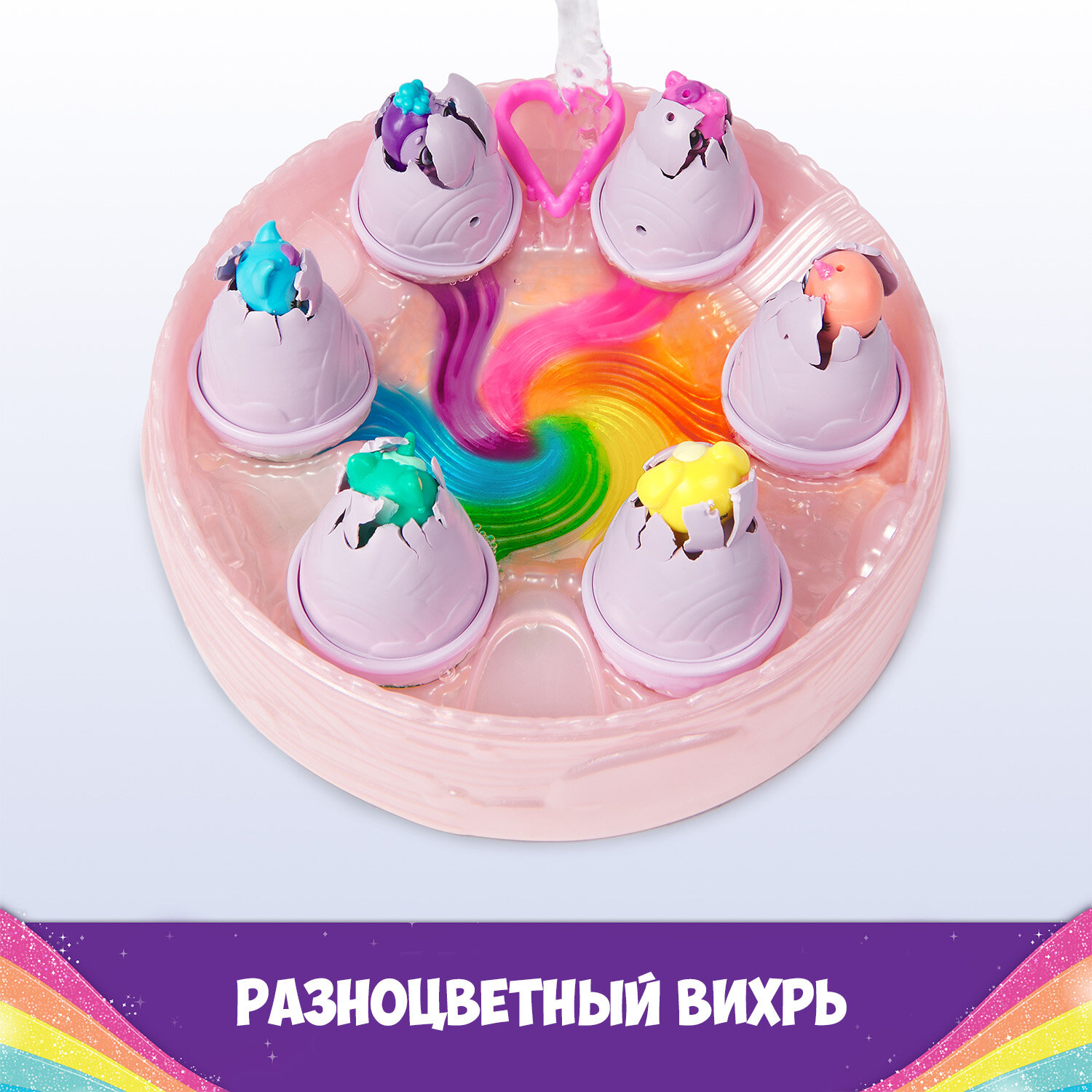 В наборе HATCHIMALS Alive ждут появления на свет сразу шесть очаровательных зверят. Им нужно помочь: снять с яиц крылышки и налить в «гнездо» (основную емкость) воду — начнется настоящее волшебство! От каждого яйца вода будет приобретать свой цвет, вместе они закрутятся в красивую радужную спираль, а малыши начнут вылупляться. Помоги им освободиться от скорлупы и присоедини крылышки. К каждому питомцу прилагается аксессуар: подгузник, медвежонок, бутылочка и многое другое.