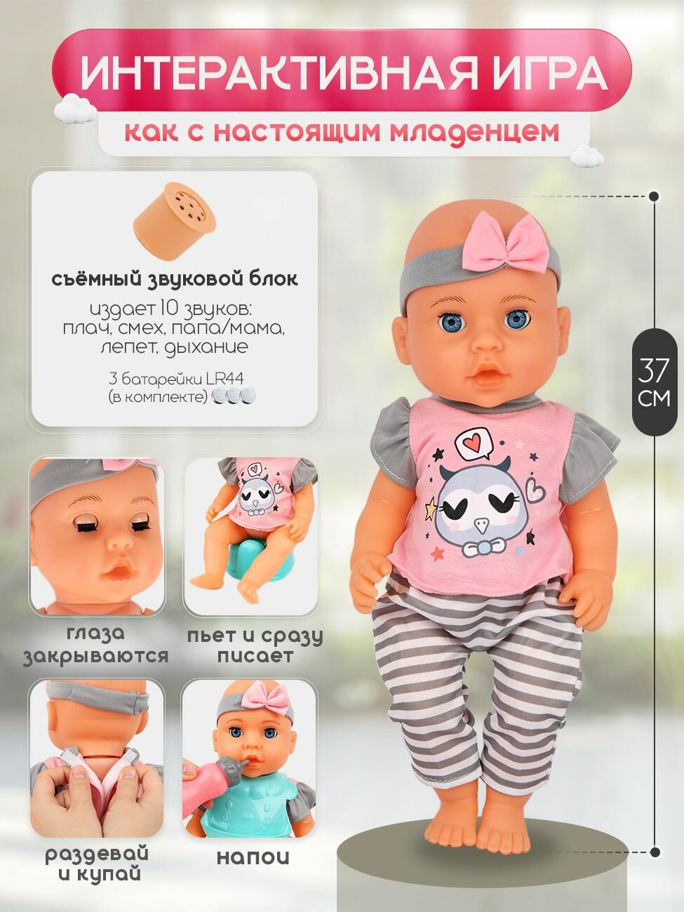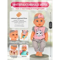 · Кукла пупс высотой 37см. без гендерных признаков, с подвижными ручками и ножками. Голова и ручки из мягкого винила, а туловище и ножки из прочного пластика. Пупс умеет пить и писать сразу после кормления. Глазки открываются и закрываются.