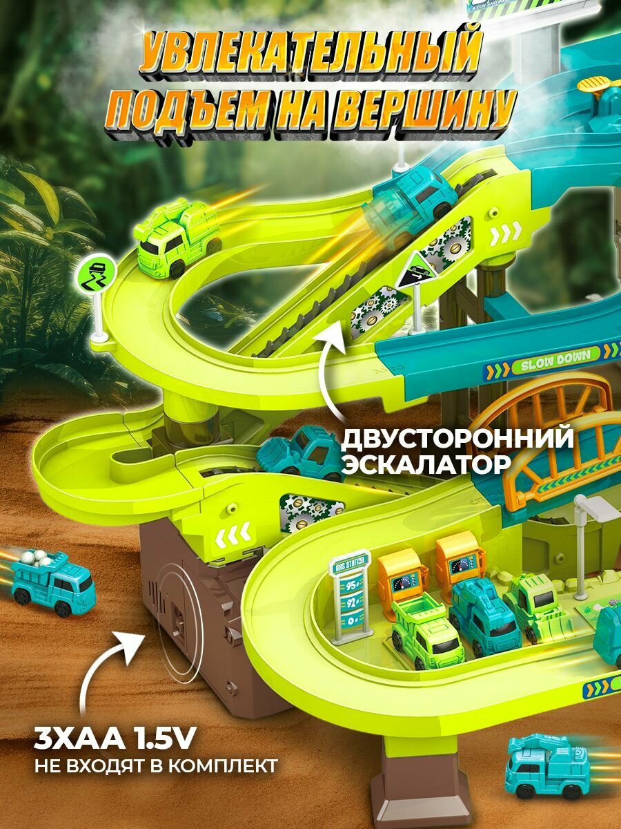 Купить Игровой набор парковка для машинок Play Okay стройка и динозавры, трек со спецтехникой, двусторонний эскалатор, звуковые эффекты с доставкой по всей России.