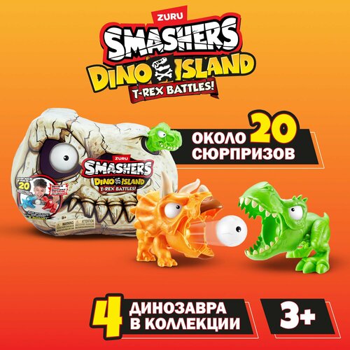 Вы готовы к решающей битве динозавров? Копайтесь в песке и слизи, чтобы найти все части окаменелостей, а затем соберите их, чтобы оживить скелеты! Закрепите светящееся глазное яблоко в пасти одного динозавра и нажмите на кнопочку управления хвостом, чтобы увидеть, как он взрывает другого. В наборе Smashers Dino Island Mini T-Rex Battles Playset вас ждёт более 20 сюрпризов: вы будете разбивать, строить и сражаться!