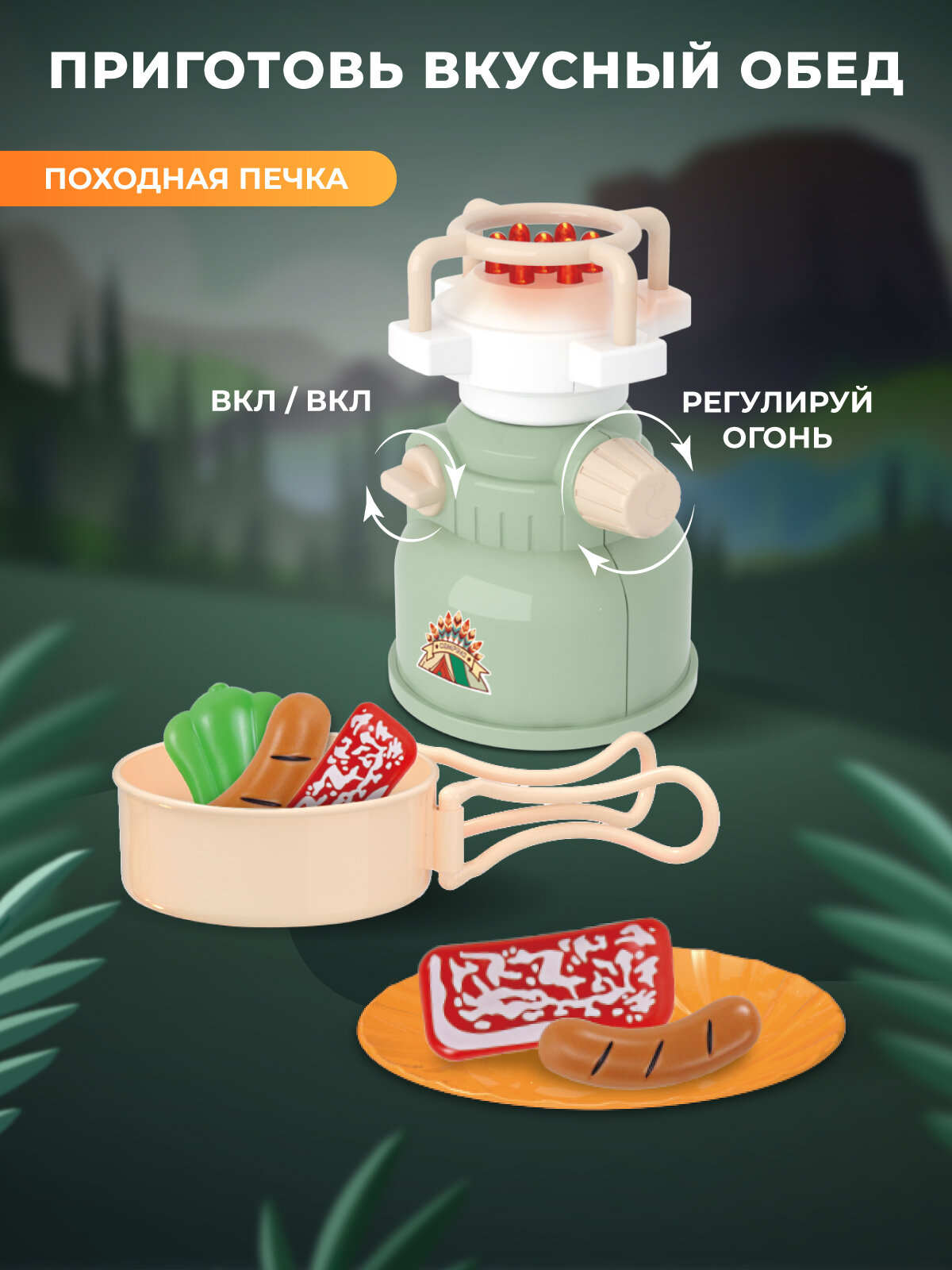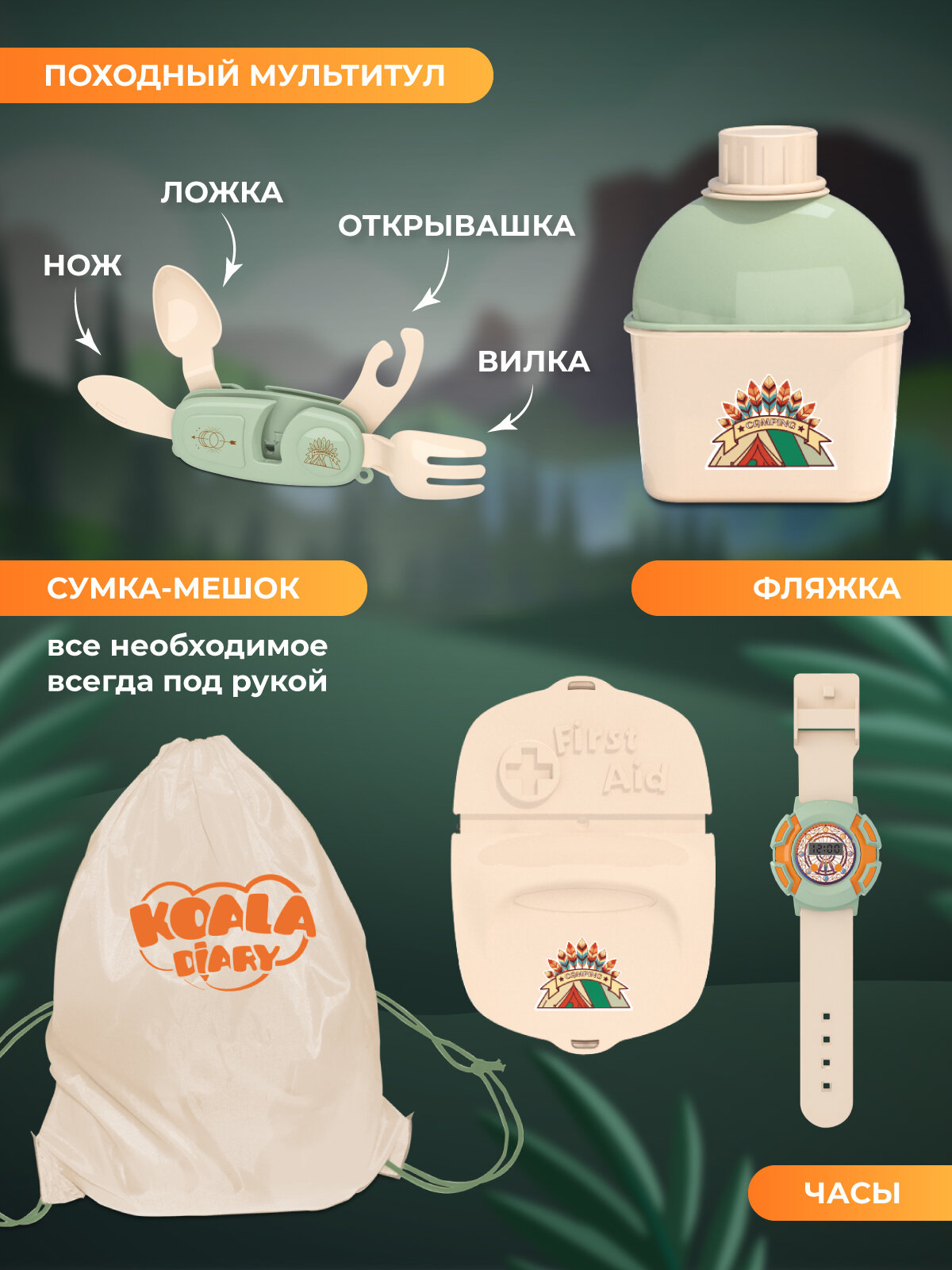 Туристический набор состоит из 25 предметов, которые помогут ребёнку почувствовать себя настоящим исследователем. Среди них: масляная лампа, фляга, бинокль, часы, фонарик-свисток, лопатка, аптечка и походный органайзер. Эти аксессуары позволят малышу окунуться в атмосферу путешествий и насладиться каждым моментом, проведённым на свежем воздухе.