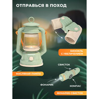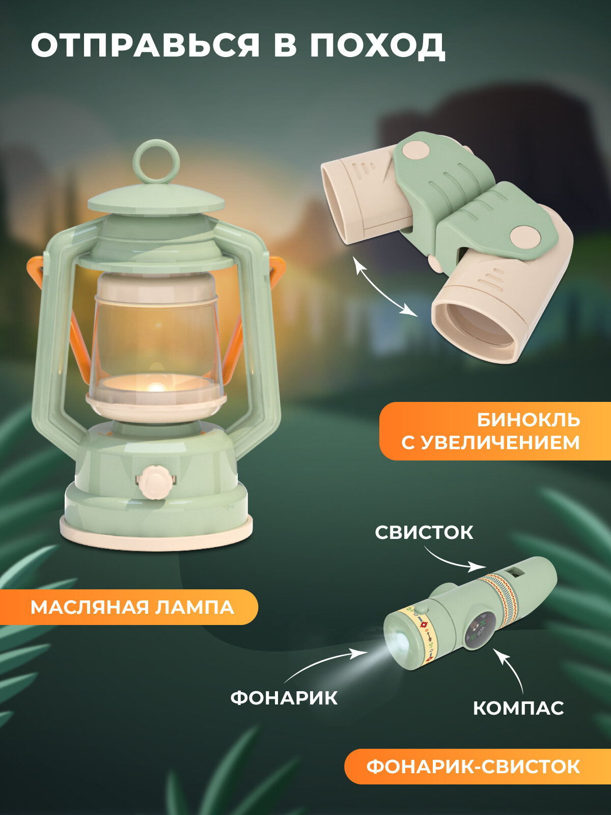 Масляная лампа, фляга, бинокль, часы, фонарик-свисток, лопатка, аптечка и походный органайзер позволят ребёнку почувствовать себя настоящим путешественником.