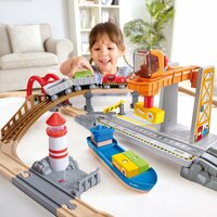 Игровой набор «Железнодорожные перевозки в порту». Это большой игровой центр с железнодорожными путями, паровозом с грузовыми вагонами, мостом, портовым краном, баржей, маяком и фигурками портовых служащих. Здесь можно организовать погрузку-разгрузку грузов, доставку их водными железнодорожным транспортом. С помощью подъёмного крана, оснащённого магнитом, можно переносить контейнеры с баржи в грузовые вагоны и обратно. А маяк (со световым сигналом) покажет дорогу в тёмное время суток и не даст потеряться прибывающему торговому судну.
