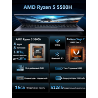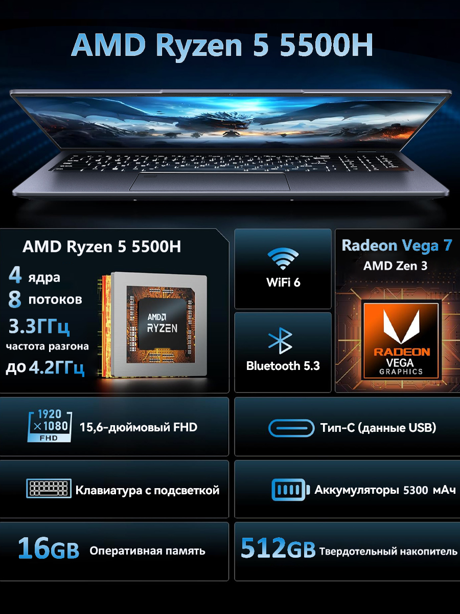 Мощная производительность для продуктивной работы: оснащен четырехъядерным процессором AMD Ryzen 5 5500U с тактовой частотой 2,1 ГГц, способным разгоняться до 4,0 ГГц и кэшем 8 МБ. Этот мощный процессор обеспечивает бесперебойную работу в многозадачном режиме и эффективное выполнение сложных задач, таких как редактирование фото и видео.
