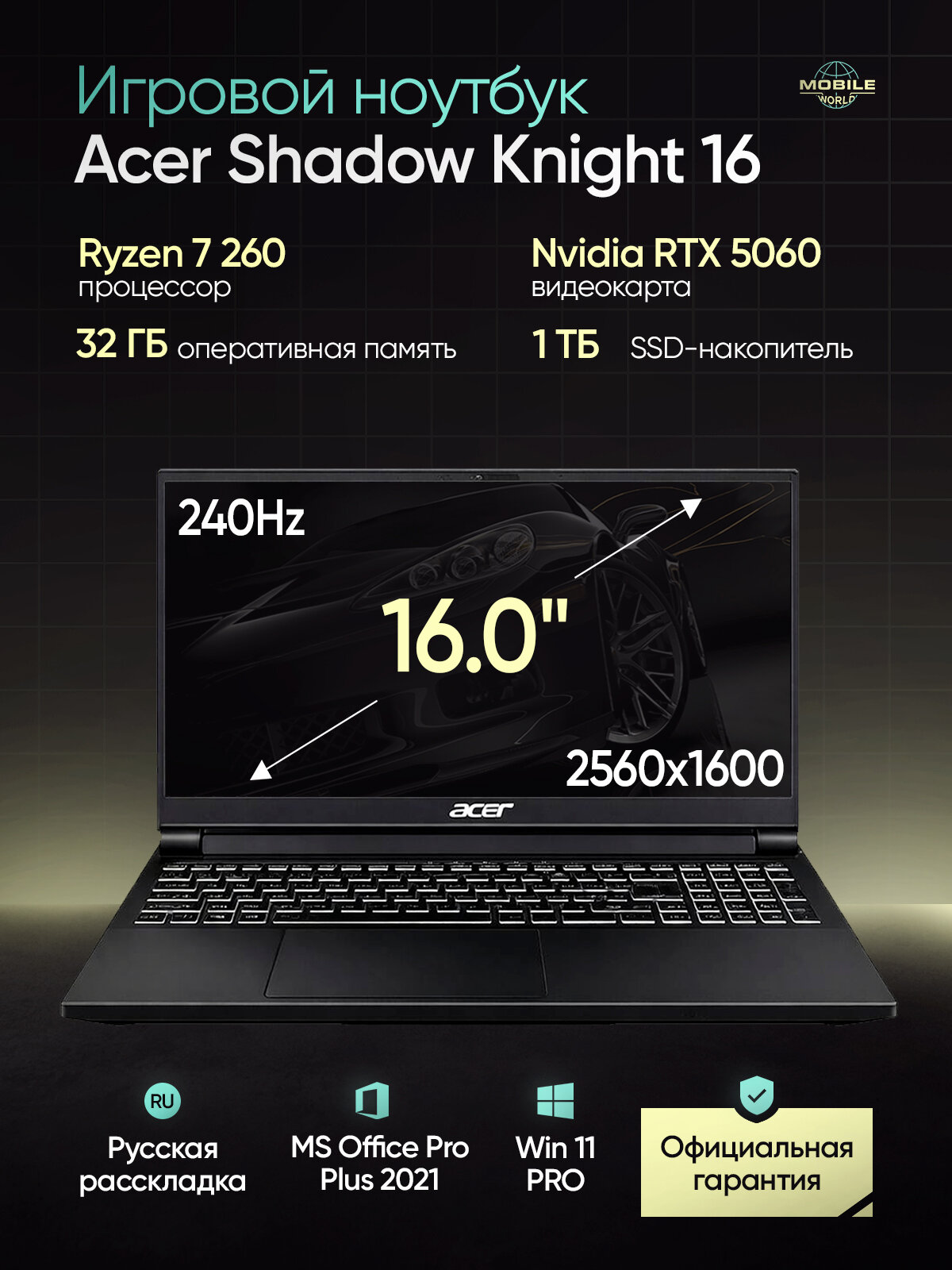 Игровой ноутбук Acer Shadow Knight 16" - мощный и надежный помощник для геймеров и профессионалов.