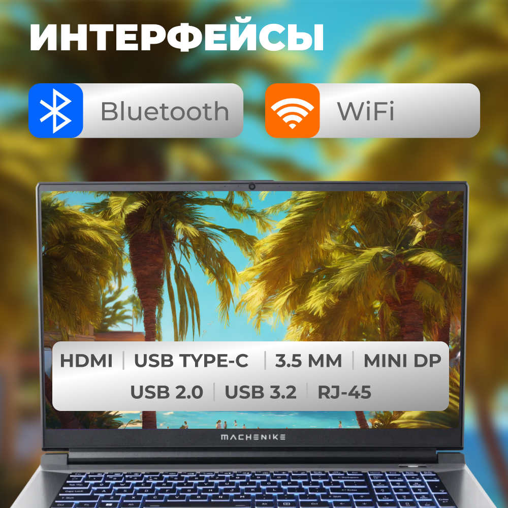 Игровой ноутбук MACHENIKE L17 Stellar M получил полноразмерную клавиатуру, ориентированную на геймеров, которая имеет настраиваемую RGB-подсветку (доступно 15 цветовых оттенков). Подключиться к интернету можно по кабельной сети через гигабитный Ethernet-порт или по беспроводному соединению, используя модуль Wi-Fi шестого поколения.