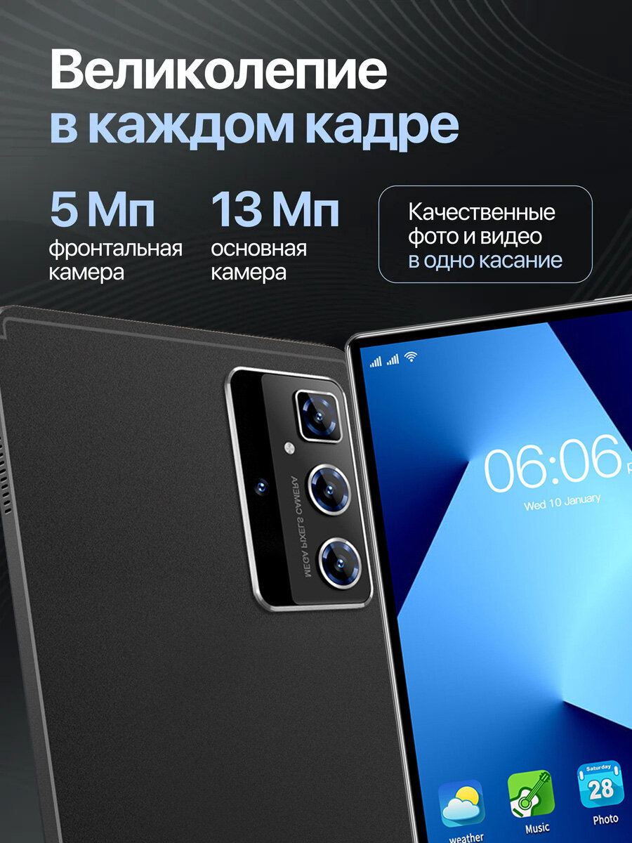 Планшет поддерживает стандарты Wi-Fi 802.11b/g/n/ac и Bluetooth 5.0, а также имеет тыловую и фронтальную камеры с автофокусом, вспышкой и разрешением 48 и 24 мегапикселей соответственно.
