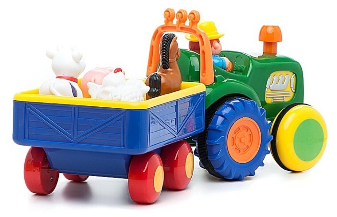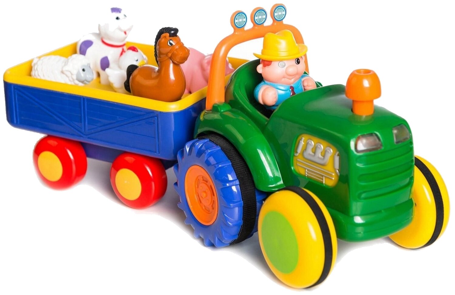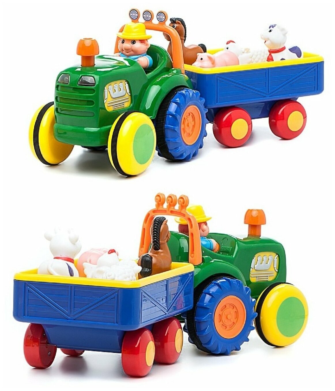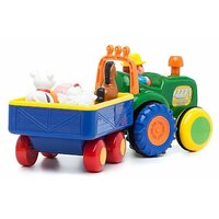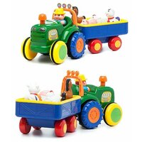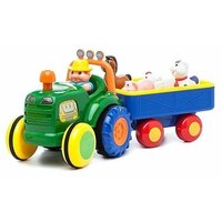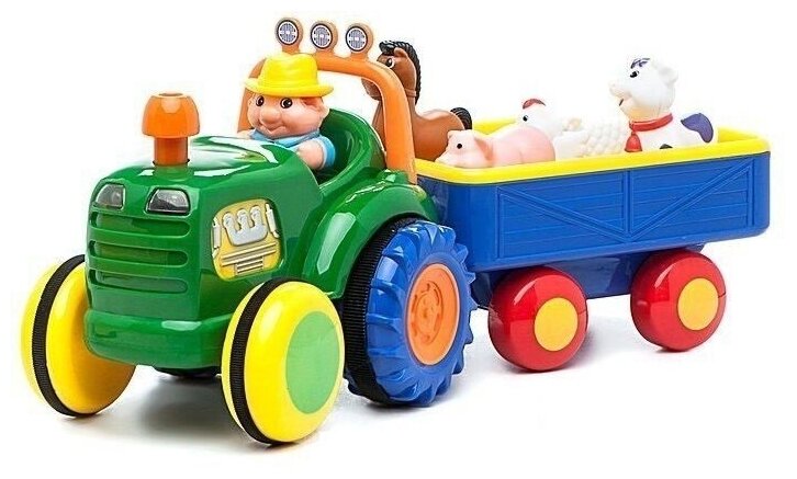 KID 049726 Игровой развивающий центр "Трактор фермера". Яркая музыкальная игрушка на колесах, озвученная на русском языке, развлечет малыша мигающими огоньками, приятной музыкой и забавными звуками. При нажатии на трубу трактор едет вперед, при этом звучат реалистичные звуки мотора, тормозов или веселые стишки. В прицепе трактора находятся 5 фигурок домашних животных. Фигурки необходимо правильно расставить по своим местам, тогда при нажатии они издают соответствующие реалистичные звуки, читают стишки, а фермер поет песенку. Фигурки зверей и фермера легко снимаются, и малыш может играть с ними отдельно. Отправляйтесь в веселую и познавательную поездку!