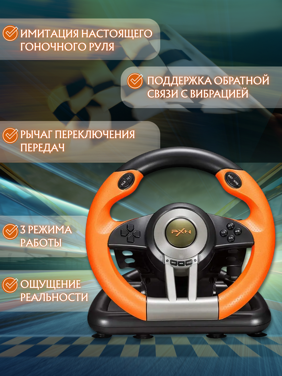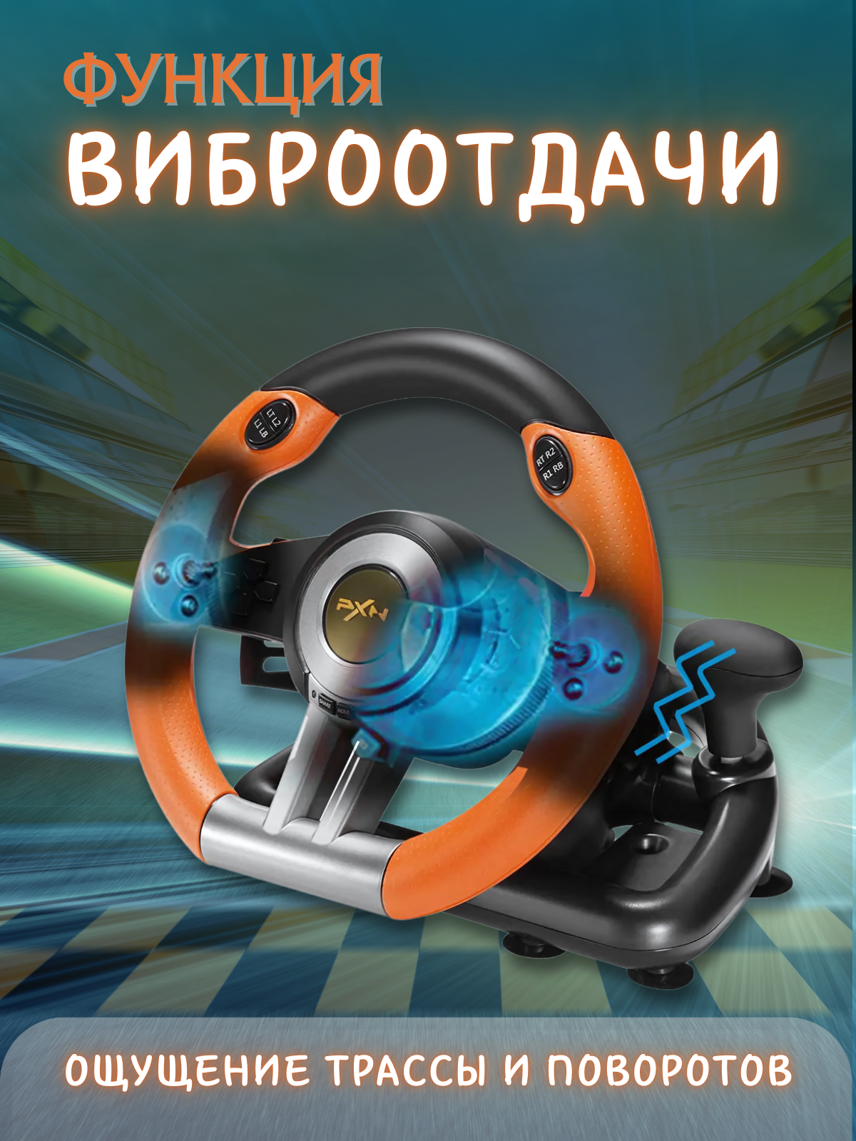 Игровой руль PXN V3PRO Racing Wheel - это реалистичное и функциональное устройство, которое обеспечивает полное погружение в игровой процесс. Реалистичная конструкция и обратная связь. PXN V3PRO Racing Wheel имеет реалистичную конструкцию, которая включает в себя 6 передач, имитирующих подрулевой переключатель гоночного автомобиля, и 16 кнопок для управления. Обратная связь и вибрация обеспечивают полное погружение в игровой процесс, делая его более реалистичным и захватывающим. Эргономичность и удобство использования. Благодаря вращению на 180 градусов и износостойкой прорезиненной оплетке, руль обеспечивает комфортное и надежное удержание рук. Складные педали с функцией газа и тормоза позволяют легко регулировать их положение в зависимости от предпочтений игрока. Совместимость с различными платформами. PXN V3PRO Racing Wheel совместим с такими платформами, как PlayStation 4, Windows PC Computer, Nintendo Switch, Xbox One и Xbox Series X. Это позволяет использовать руль с различными игровыми консолями и компьютерами. Простота подключения и настройки. Игровой руль подключается к ПК через USB-интерфейс, а длина кабеля составляет 2 метра. В комплекте с рулем идут складные педали газа и тормоза, а также CD-диск с инструкцией по установке и использованию. Игровой руль PXN V3PRO Racing Wheel - отличный выбор для тех, кто хочет получить максимальное удовольствие от игры и погрузиться в мир виртуальных гонок.