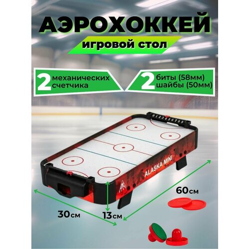 Размер игрового поля: 58 х 28 см; размер стола: 60 х 30 х 13 см; Диаметр бит: 6,5 cм; Диаметр шайб: 4 см