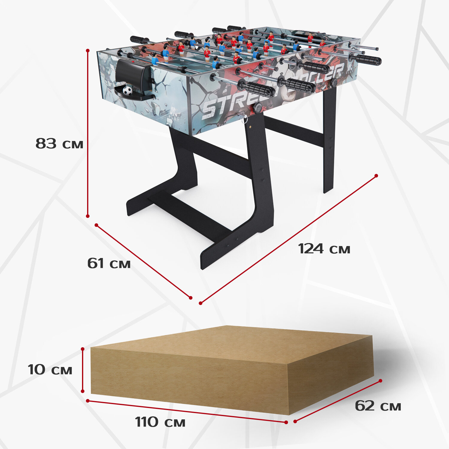 В комплекте с настольным футболом вы получите два футбольных мяча диаметром 31 мм, которые обеспечат реалистичность игры, и механический счетчик для подсчета очков. Стержни диаметром 13 мм уже в сборе с игроками высотой 77 мм. Ножки толщиной 15 мм, перекладина между ножками толщиной 12 мм.