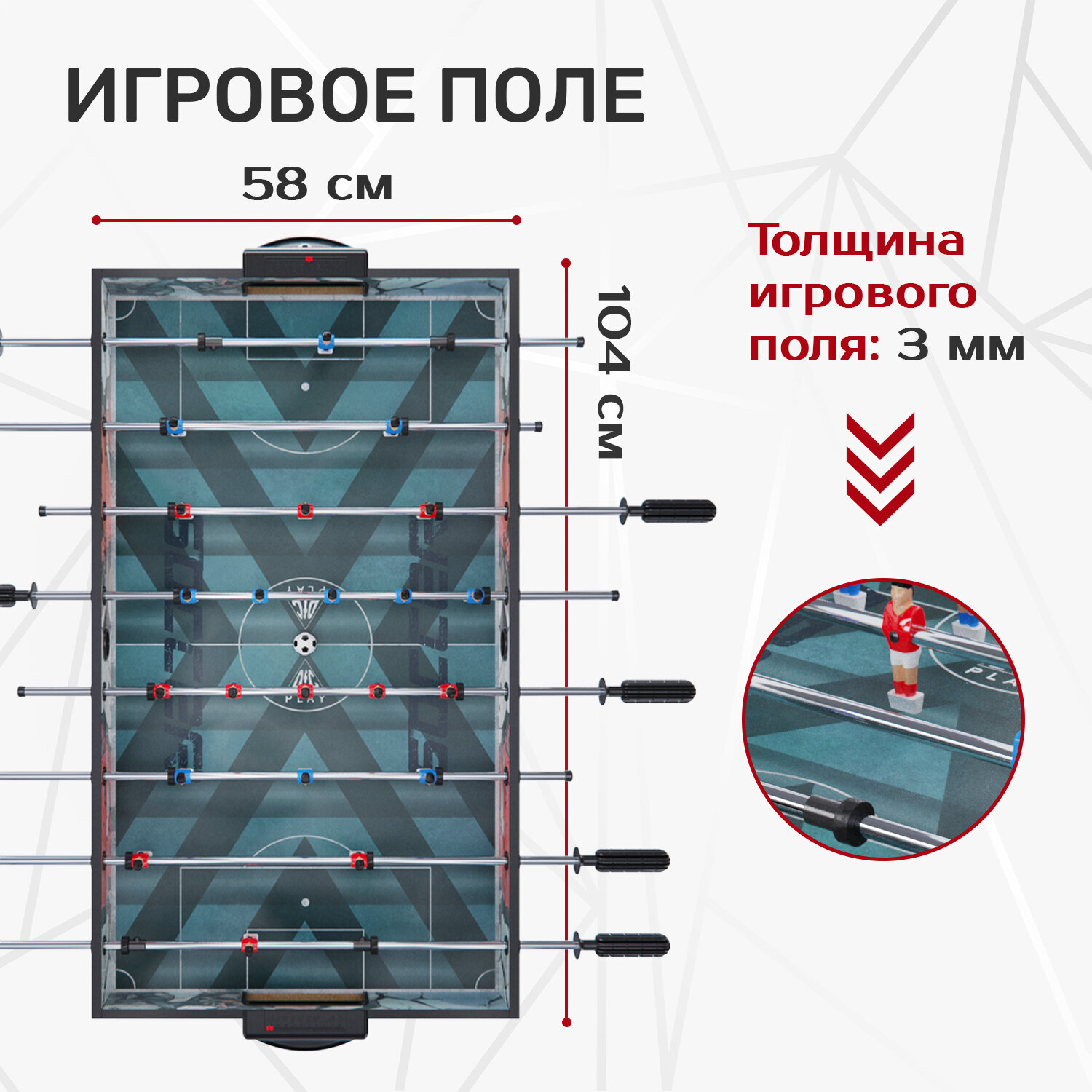 Ламинированное ПВХ покрытие игрового поля придает столу привлекательный вид и повышает его износостойкость. Размеры игрового поля составляют 104 х 58 см, а его толщина 3 мм, что делает игру комфортной и захватывающей. Благодаря складной конструкции стол легко сложить и убрать в целях экономии пространства дома.