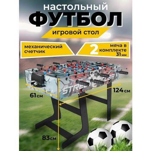 В комплекте с настольным футболом вы получите два футбольных мяча диаметром 31 мм, которые обеспечат реалистичность игры, и механический счетчик для подсчета очков. Стержни диаметром 13 мм уже в сборе с игроками высотой 77 мм. Ножки толщиной 15 мм, перекладина между ножками толщиной 12 мм.
