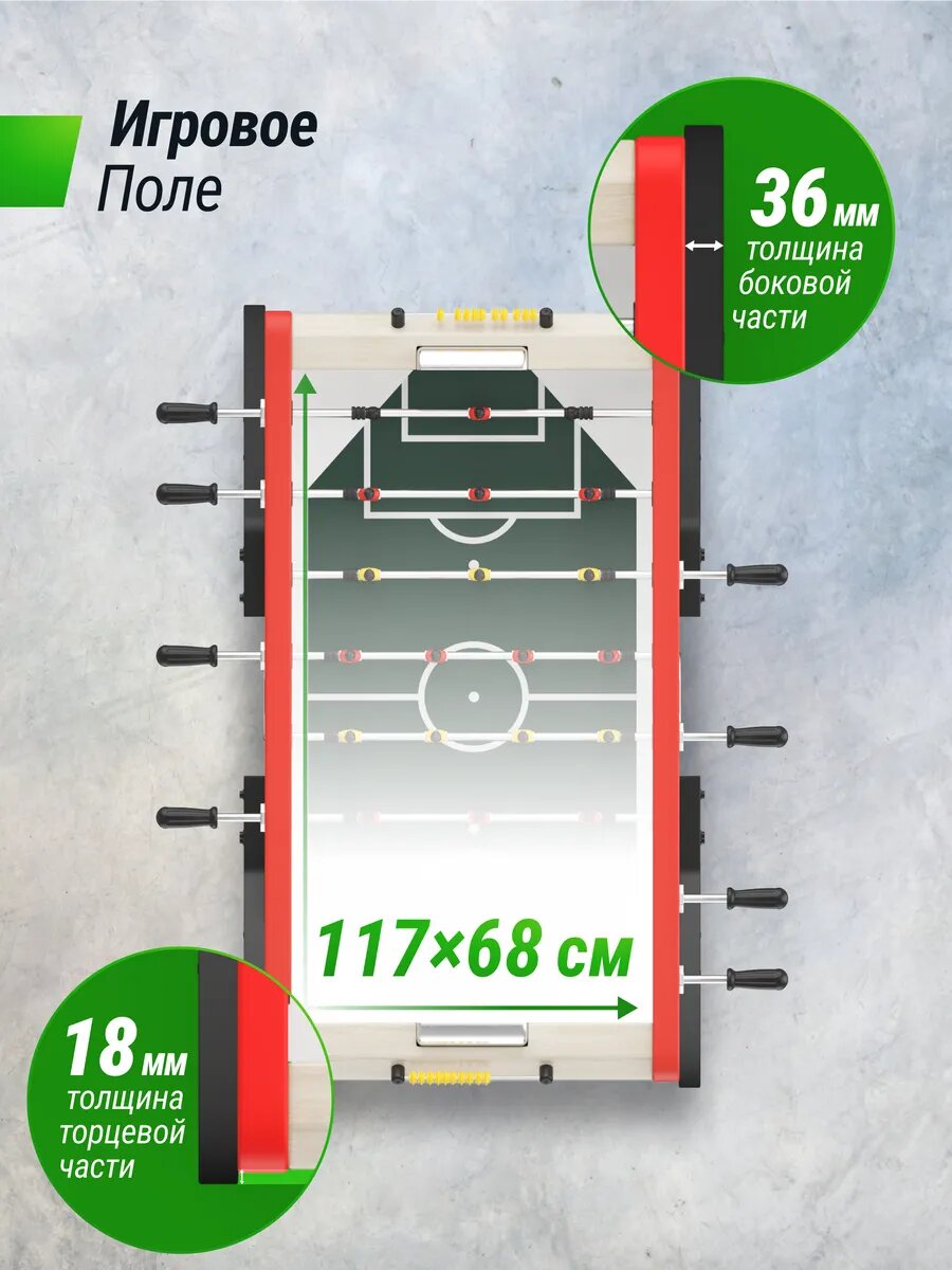 Особенностью игрового стола является механический счетчик, который позволяет отслеживать количество голов и ударов. Это делает игру более интересной и динамичной, а также мотивирует на достижение новых результатов.