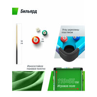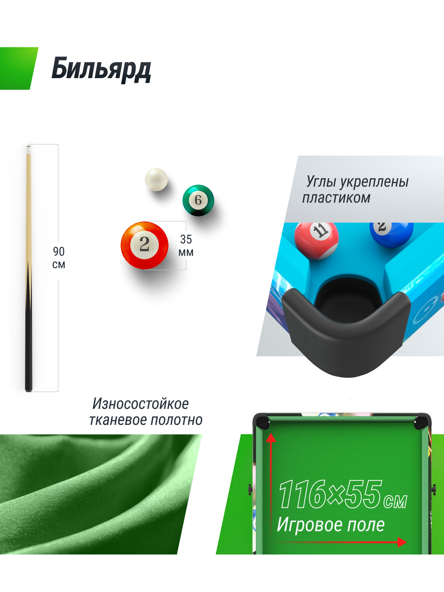 Аксессуары в комплекте: 2 кия, шары, треугольник, мел, 2 биты, 2 шайбы, 2 клюшки, 2 шайбы, 2 ракетки, 2 шарика, сетка.