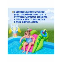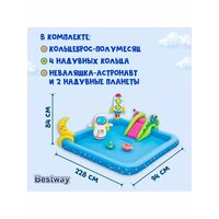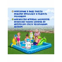 Игровой центр BESTWAY «Маленький астронавт» 228х206х84 см – это настоящий детский центр водных развлечений для малышей от двух лет. Дети отправятся в увлекательное космическое путешествие и будут играть в интересные подвижные игры: 2 вида фрисби, метание колец, а также смогут охладиться от летней жары под приятными брызгами фонтана и скатиться с горки. Центр подключается к садовому шлангу. Изделие выполнено из прочного ПВХ, быстро устанавливается. Максимальная нагрузка – 45 кг.