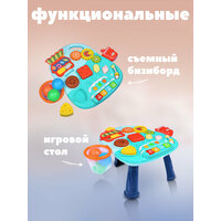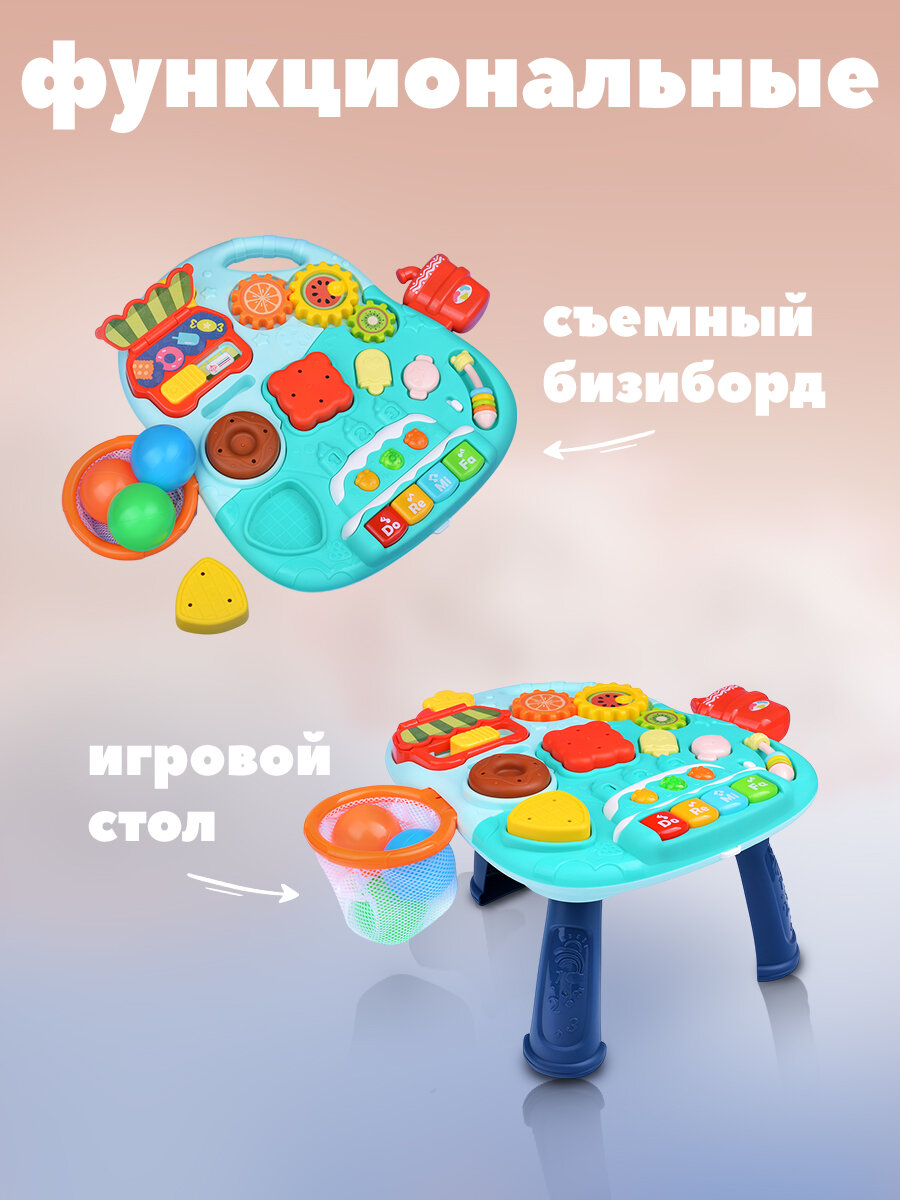 Представляем вашему вниманию яркую и функциональную игрушку, которая представляет из себя каталку-ходунки. Размеры игрушки составляют 44x43 см. Игрушка-трансформер может быть модифицирована как несколько различных предметов: ходунки (46х44х43 см.), каталка (54х33х47 см.), самокат (54х33х47 см.), игровой столик (37х31х18 см.). На передней части ходунков располагаются различные элементы, которые привлекут внимание малыша и помогут ему в развитии моторики, координации движений и тактильных ощущений. Помимо ходунков, игрушка представляет собой сортер для малышей и бизиборд. Здесь вы найдете баскетбольное кольцо, вращающиеся шестерёнки, сортер, звуковой модуль. Звуковой модуль воспроизводит 4 весёлые мелодии, 6 колыбельных мелодий, , которые обязательно понравятся вашему ребенку, а также имеет 4 ноты 2 режима громкости. Работает игрушка от трех батареек типа АА (приобретаются отдельно). В комплекте с ходунками идет 3 шарика и 3 фигурки для сортера, что позволяет малышу играть и развиваться одновременно. Игрушка имеет функцию блокировки задних колёс. Для утяжеления конструкции можно набрать воды в специальный резервуар. Для устойчивости посередине колёс есть противоскользящая полоска.Ходунки изготовлены из качественного пластика, а их дизайн выполнен в ярких и привлекательных для детей цветах. Продукт соответствует всем требованиям безопасности и прошел необходимые проверки качества. С таким сортером ваш ребенок будет с удовольствием изучать окружающий мир и развивать такие навыки как моторика, воображение, тактильное восприятие, музыкальный слух и логика.