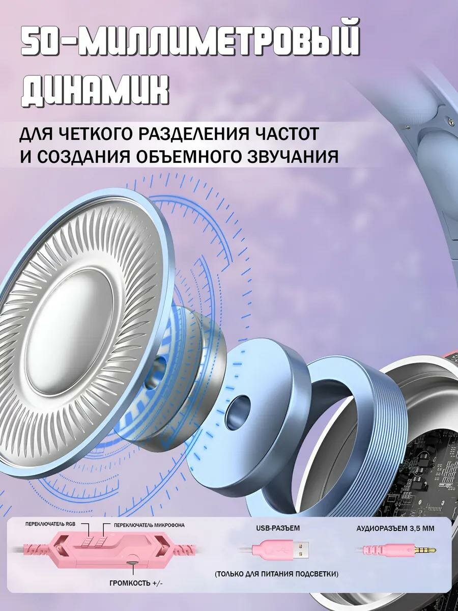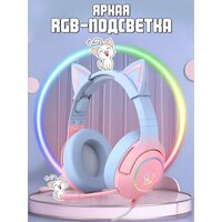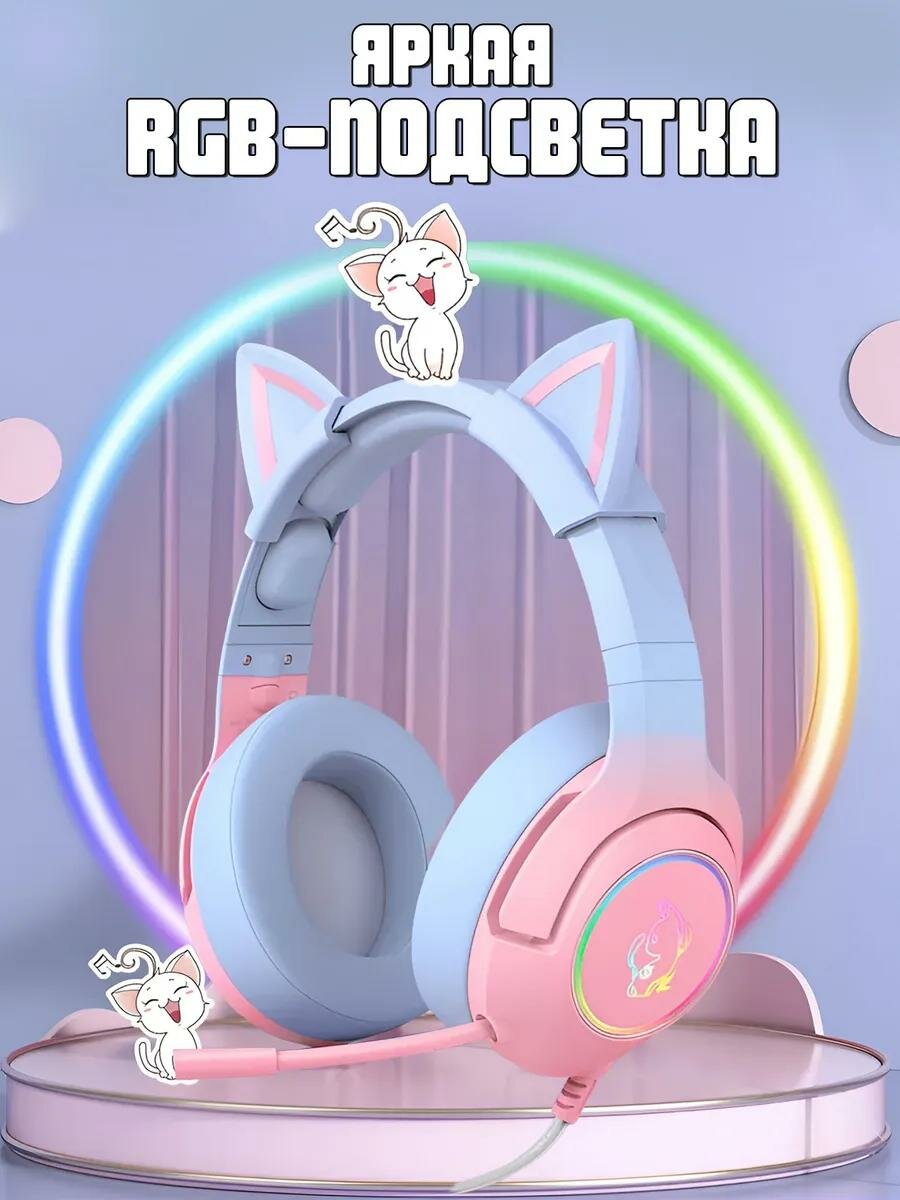 Игровые проводные наушники ONIKUMA K9 с RGB подсветкой и съемными ушками, Голубые с розовым