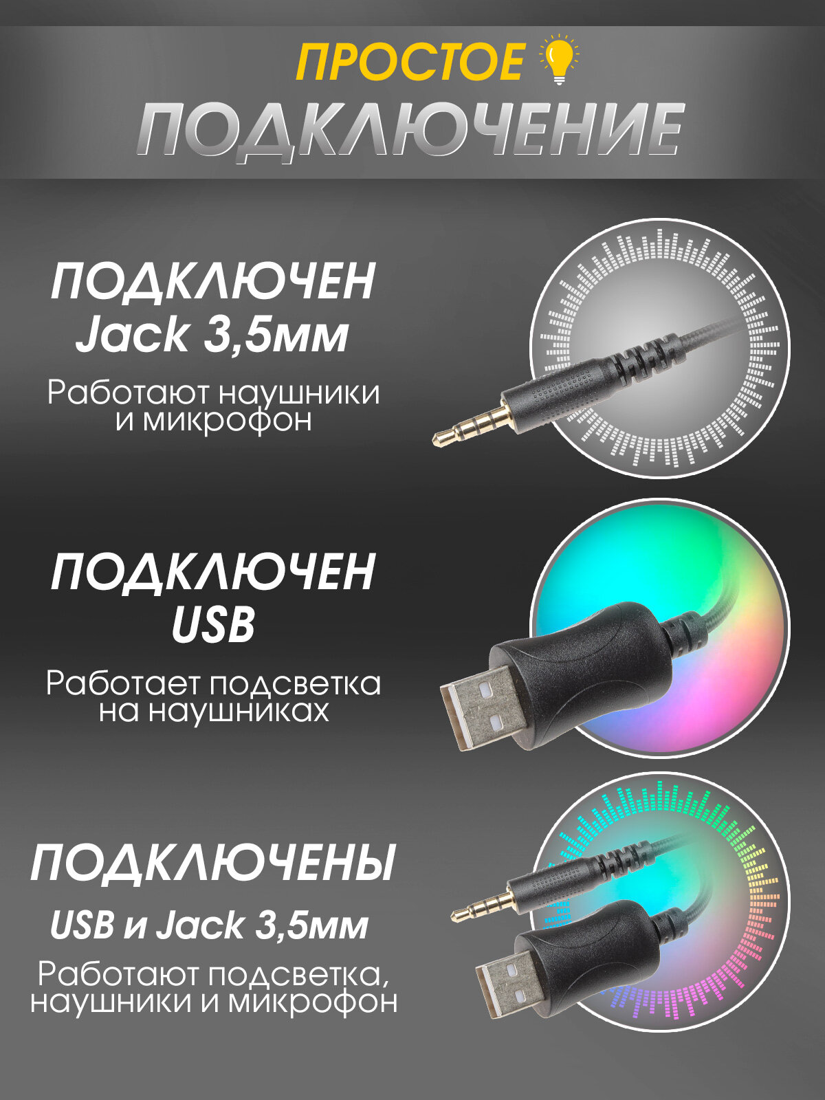 | Особенности | RGB подсветка, вентиляция амбушюров, витой шнур, двойное оголовье, детские, мягкие амбушюры, отключение микрофона, отсоединяемый кабель, прямой разъем, регулировка громкости, складная конструкция, шумоподавление |
