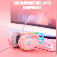 Чистый звук и уникальный дизайн – это ONIKUMA. Мы представляем полноформатные проводные наушники от мирового бренда ONIKUMA! Наушники с микрофоном отлично подойдут для ваших любимых игр и активных бесед с друзьями. Аксессуар подключается к ПК, Mac, мобильным устройствам, Xbox, PS4, Switch при помощи двух штекеров 3.5 Jack. Включение/выключение микрофона и регулировка громкости динамиков осуществляется с пульта управления, расположенного на проводе. Большие амбушюры полностью охватывают ушную раковину, плотно прилегают и изолируют от посторонних звуков для максимальной концентрации на игровом процессе. Наушники ONIKUMA Pink Space выполнены в нежно-розовом цвете в матовом исполнении. Другая отличительная особенность – наличие яркой RGB-подсветки с ободком, которая автоматически включается при подключении игровых наушников к вашему гаджету через USB-штекер. Наушники с подсветкой – это привлекательный атрибут и отличный подарок для геймера.