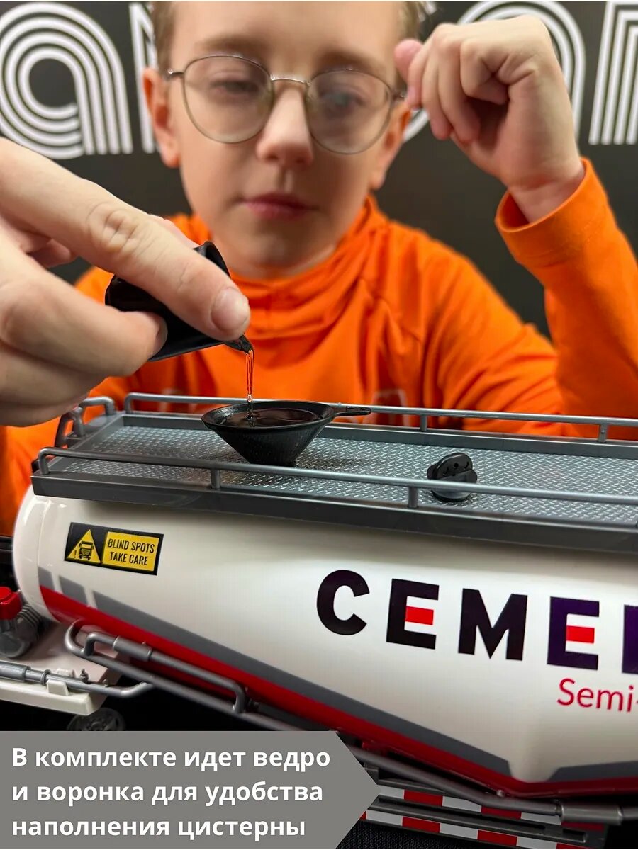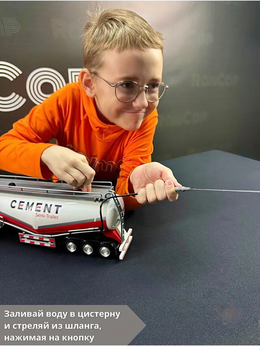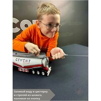 Настоящим сюрпризом для ребёнка станет функция подачи воды. В комплект входят ведёрко и воронка, с помощью которых можно залить воду в цистерну. Нажмите на специальную кнопку — и цементовоз начнёт разбрызгивать воду, как настоящий рабочий грузовик! Это делает игрушку особенно интересной для игр на улице или в песочнице.