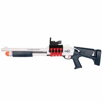 Помповый дробовик стреляет мягкими снарядами. Отличительной чертой является реалистичные механизмы стрельбы и перезарядки. Мягкие патроны снаряжаются в гильзы, которые входят в комплект. При взведении затвора помпового дробовика гильза выбрасывается наружу и, как в настоящем дробовике, происходит досыл патрона из магазина. Оснащен коллиматорным прицелом с подсветкой и патронташем. Мягкие патроны безопасны.