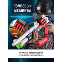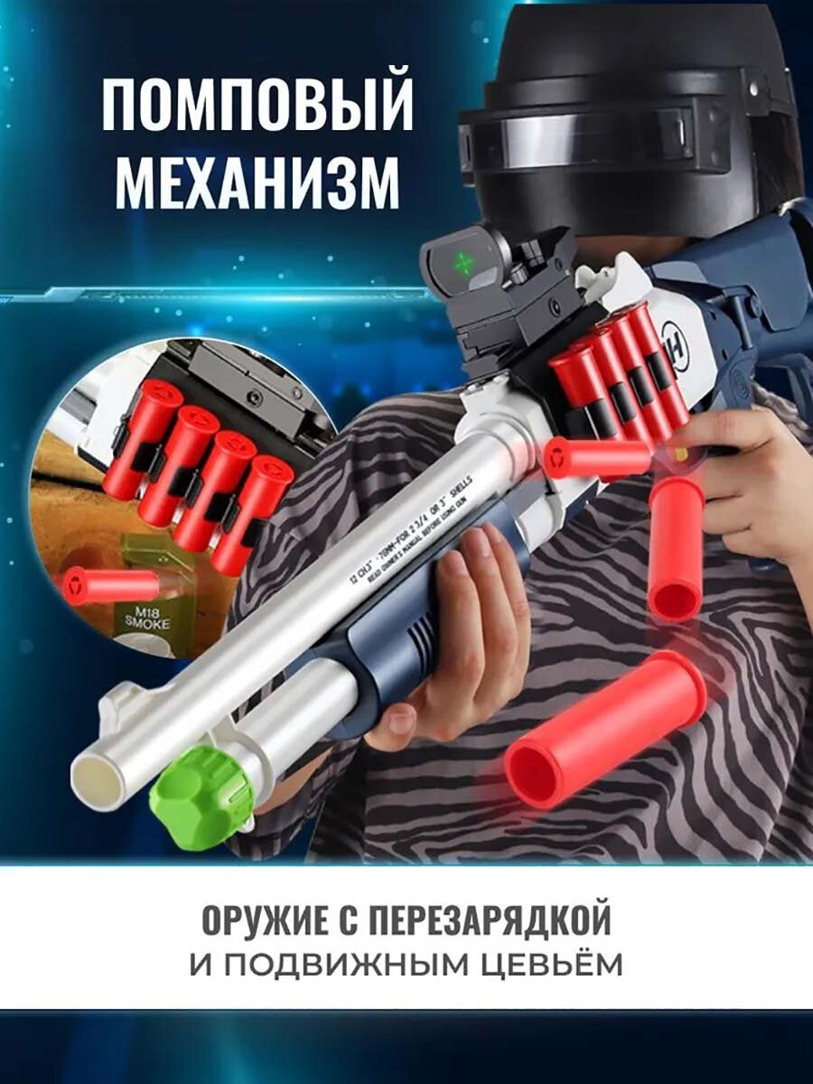 Помповый дробовик стреляет мягкими снарядами. Отличительной чертой является реалистичные механизмы стрельбы и перезарядки. Мягкие патроны снаряжаются в гильзы, которые входят в комплект. При взведении затвора помпового дробовика гильза выбрасывается наружу и, как в настоящем дробовике, происходит досыл патрона из магазина. Оснащен коллиматорным прицелом с подсветкой и держателем для патронов. Мягкие патроны безопасны, ребенок, мебель и кот не пострадают. Процесс стрельбы по мишеням и механика перезарядки понравится и взрослым!