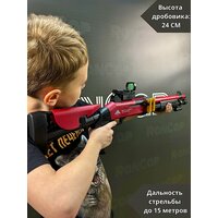 Дробовик стреляет мягкими снарядами. Отличительной чертой является реалистичные механизмы стрельбы и перезарядки. Мягкие патроны снаряжаются в гильзы, которые входят в комплект. При взведении затвора гильза выбрасывается наружу, как в настоящем дробовике. Оружие оснащено держателем для патронов и коллиматорным прицелом с подсветкой. Так же у игрушки регулируется приклад. Мягкие патроны безопасны.