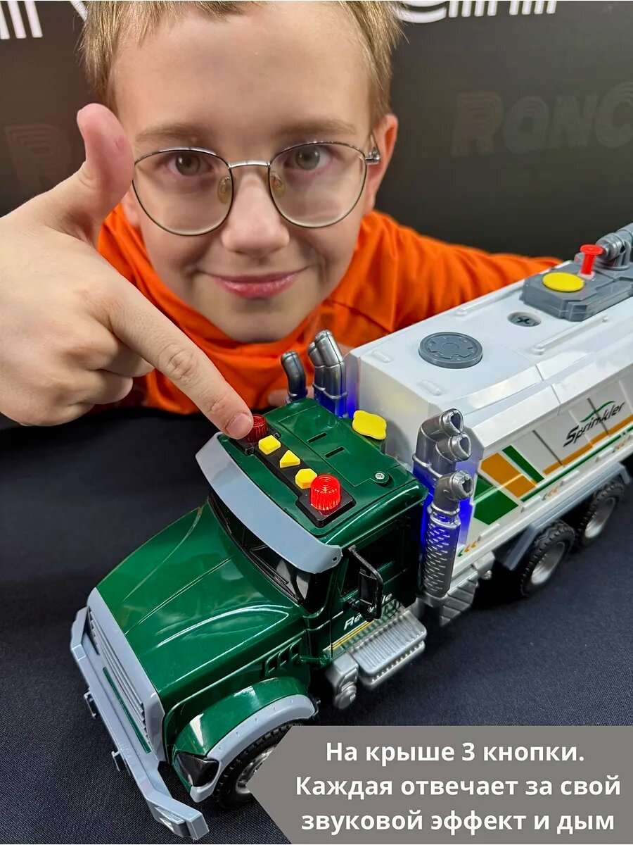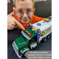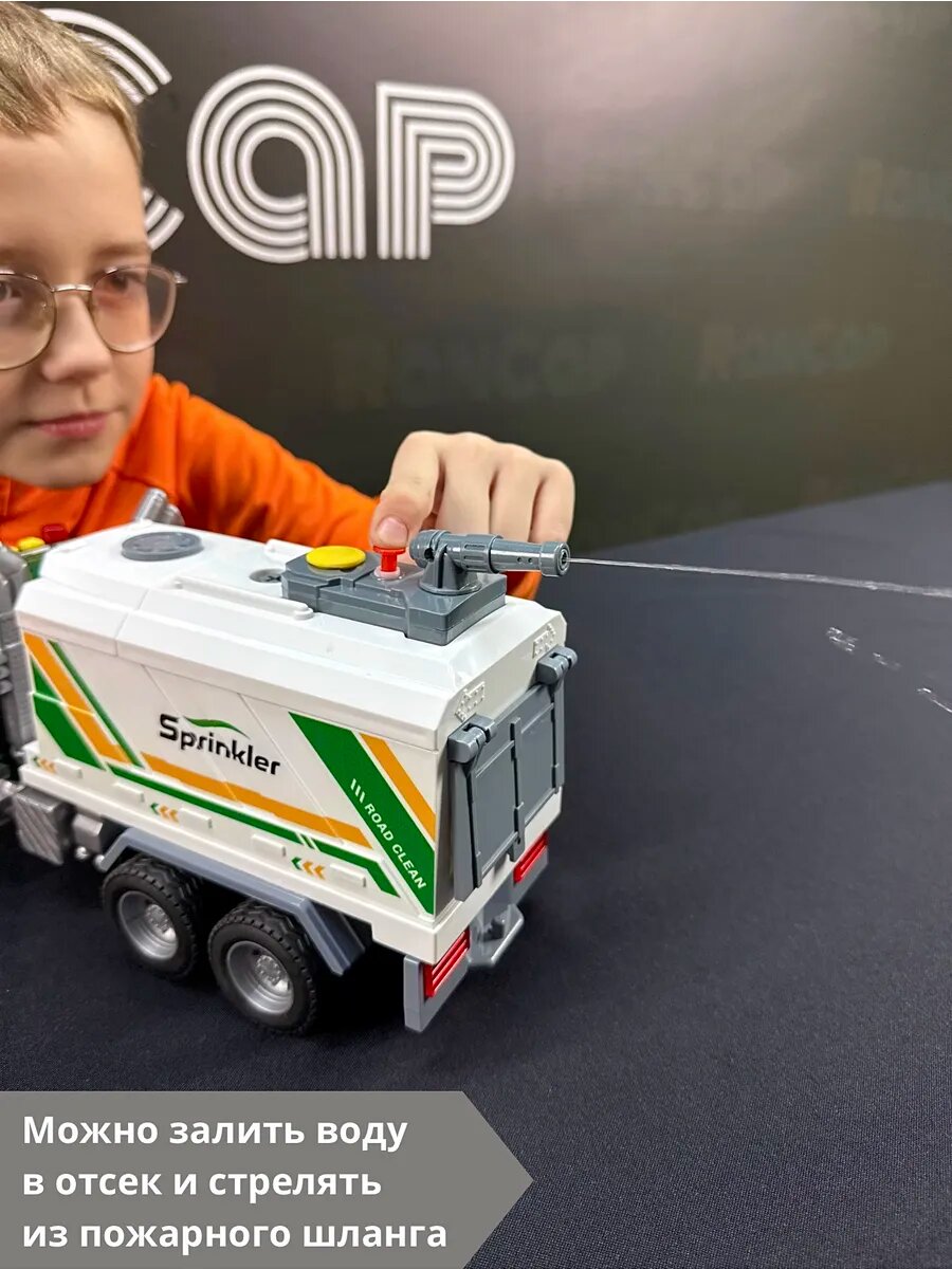 Санитарная машина — это дорожная техника, с которой ребёнок почувствует себя героем-спасателем. Залейте воду в специальный бак, нажмите на одну из 3 кнопок на крыше — включатся фары, сирена, звук мотора и активируется эффект дыма, который идёт из труб грузовика. Реалистичные эффекты создают атмосферу настоящей спасательной операции.