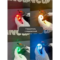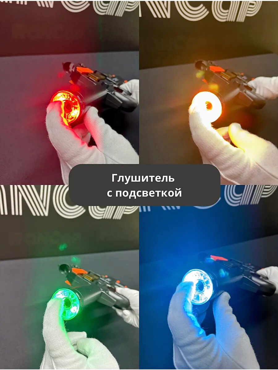 - Световой глушитель с 8 вариантами подсветки — при пролёте пульки через ствол происходит яркая световая вспышка, что имитирует настоящий выстрел.