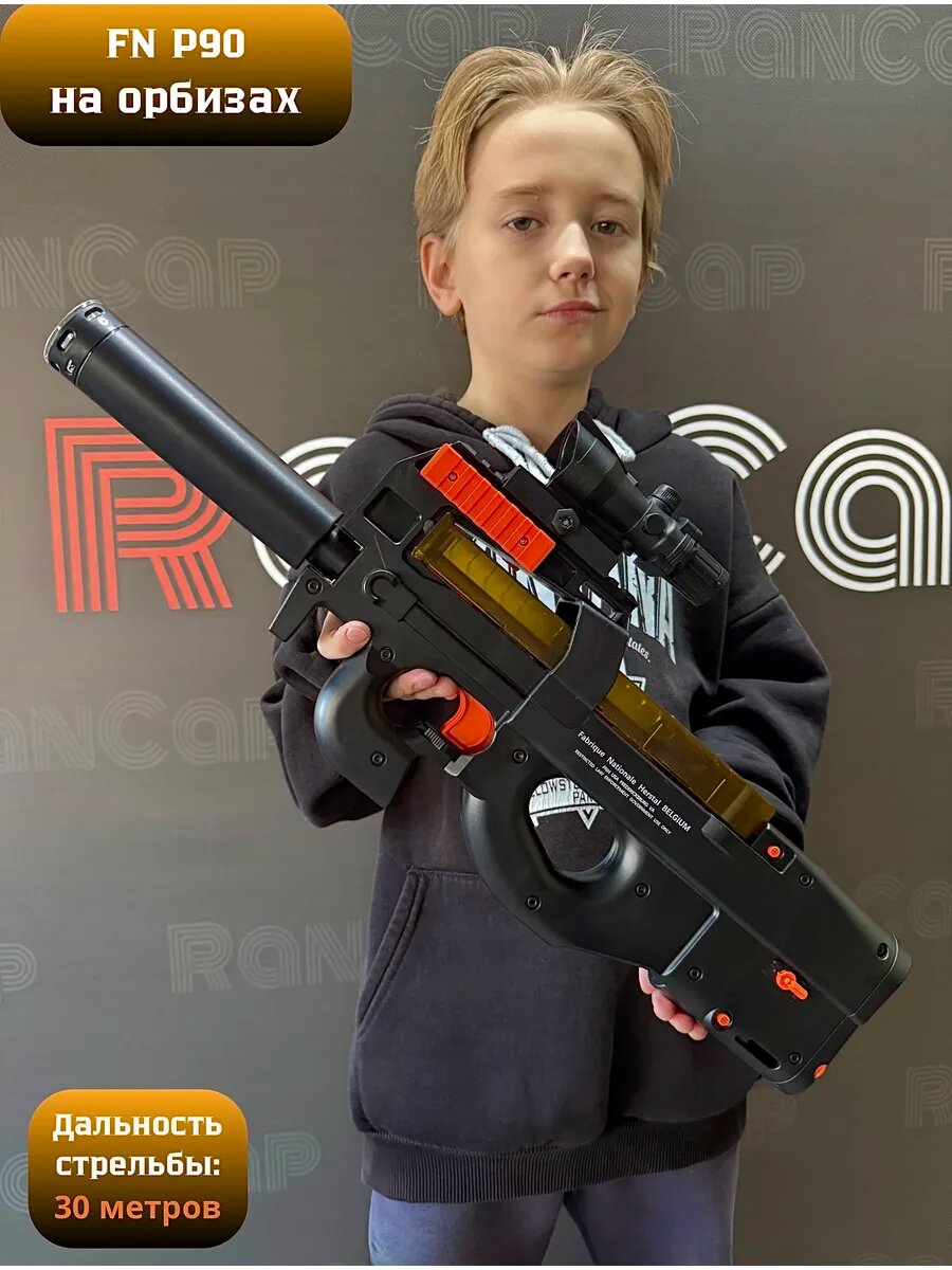 Представляем пистолет‑пулемёт FN P90 на орбизах черного цвета — реалистичная и безопасная игрушка для активных игр и ролевых сражений.