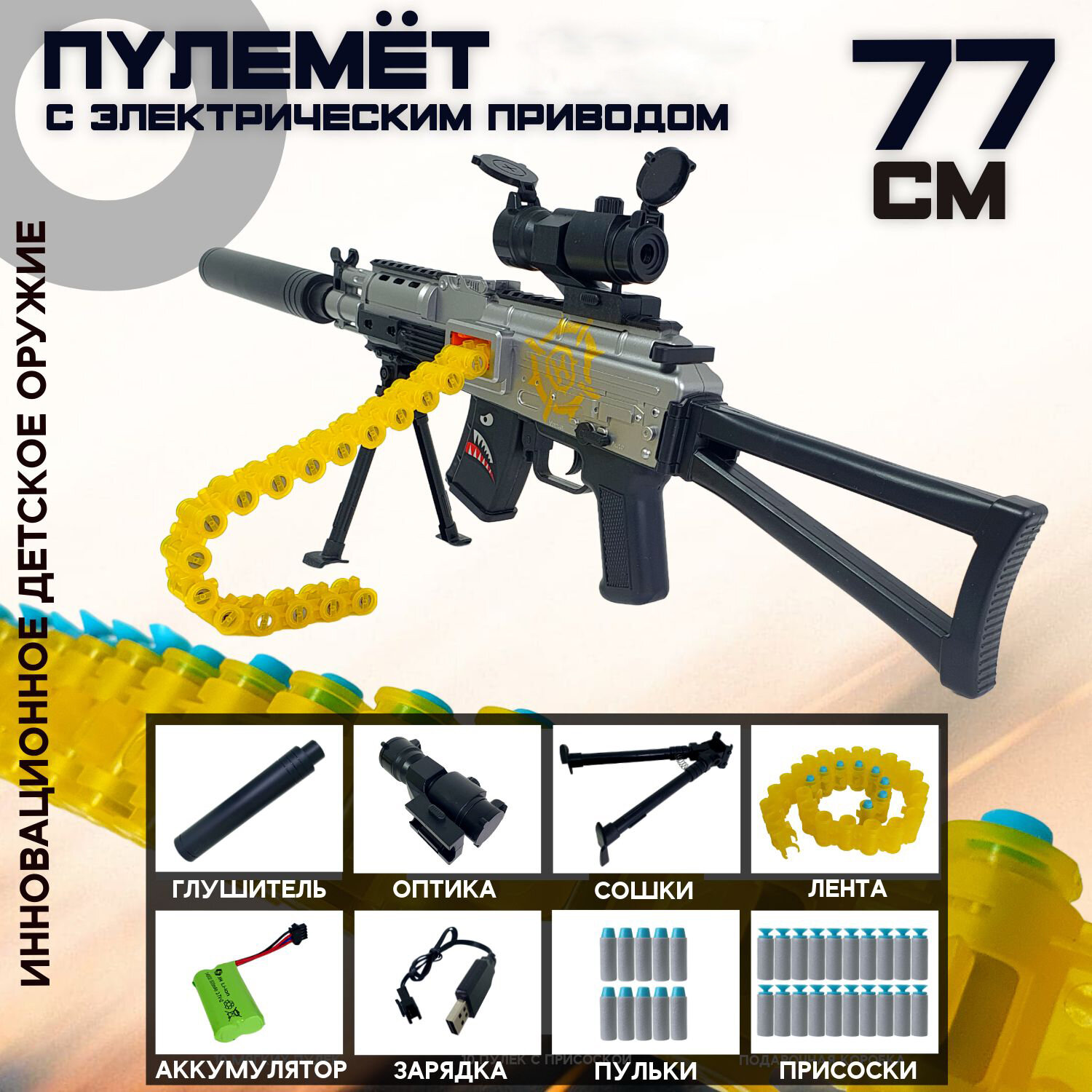 Игрушечный пулемет 77 см, с электрическим приводом и оптическим прицелом, стреляет мягкими пулями, серебристый: сравнение цен, характеристики, фото, актуальное наличие и цены.