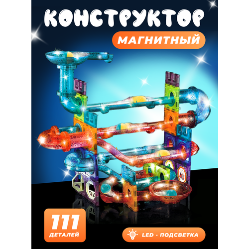 Игровой набор магнитный светящийся конструктор состоит из 111 элементов, из которых легко можно собрать многоуровневую горку с башнями, по которой скатываются 8 пластмассовых шариков, входящих в комплект.