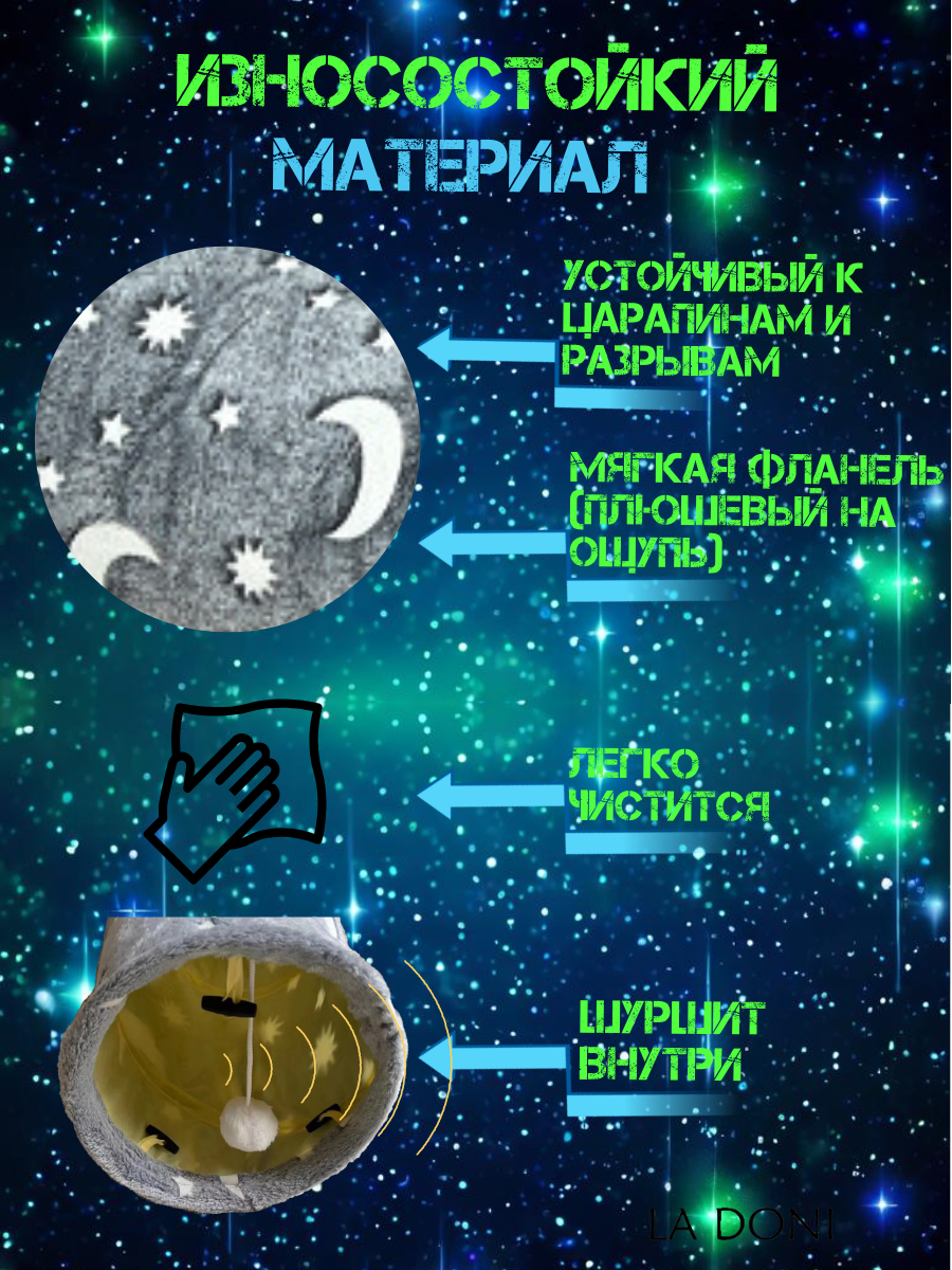 Туннель выполнен из прочного и безопасного материала, который выдержит даже самые активные игры. Его просторный дизайн позволяет кошкам свободно передвигаться и исследовать. Будь то прятки, погоня или просто уютное укрытие, туннель станет универсальным решением для активного времяпрепровождения.