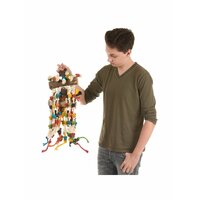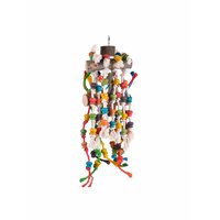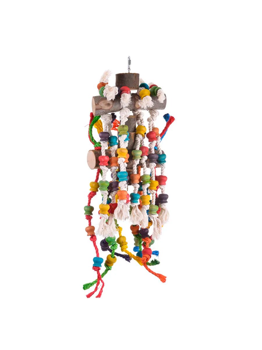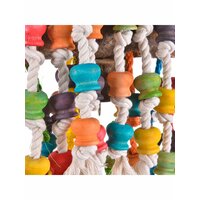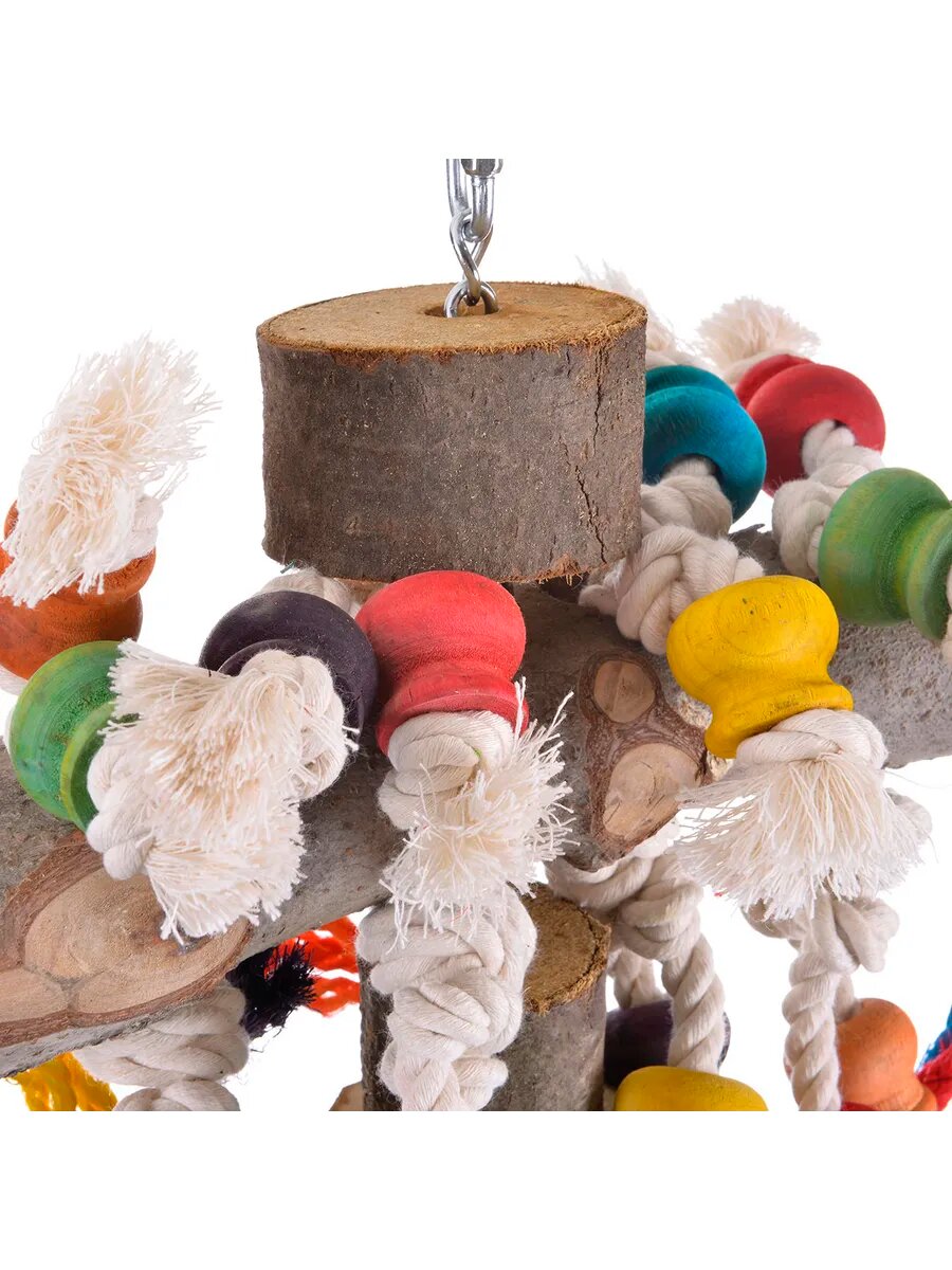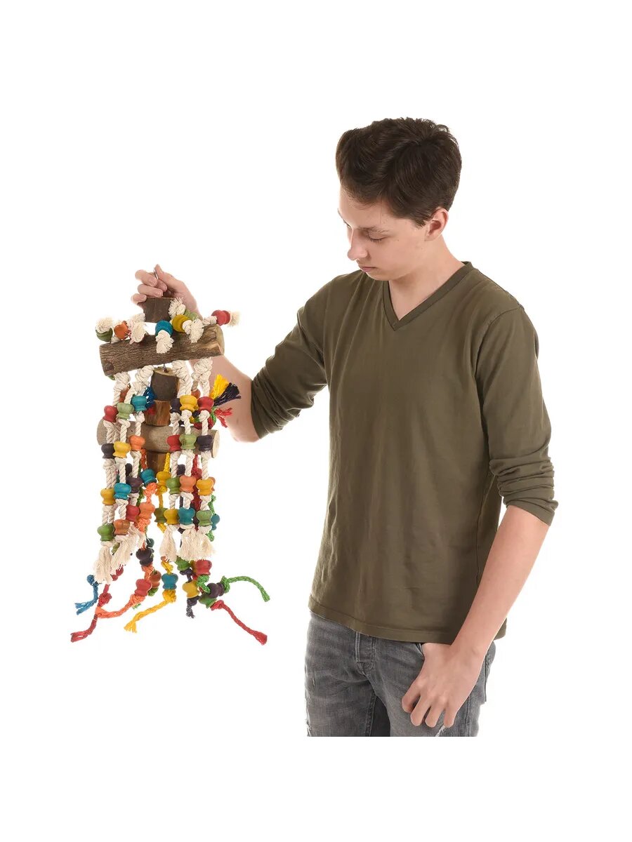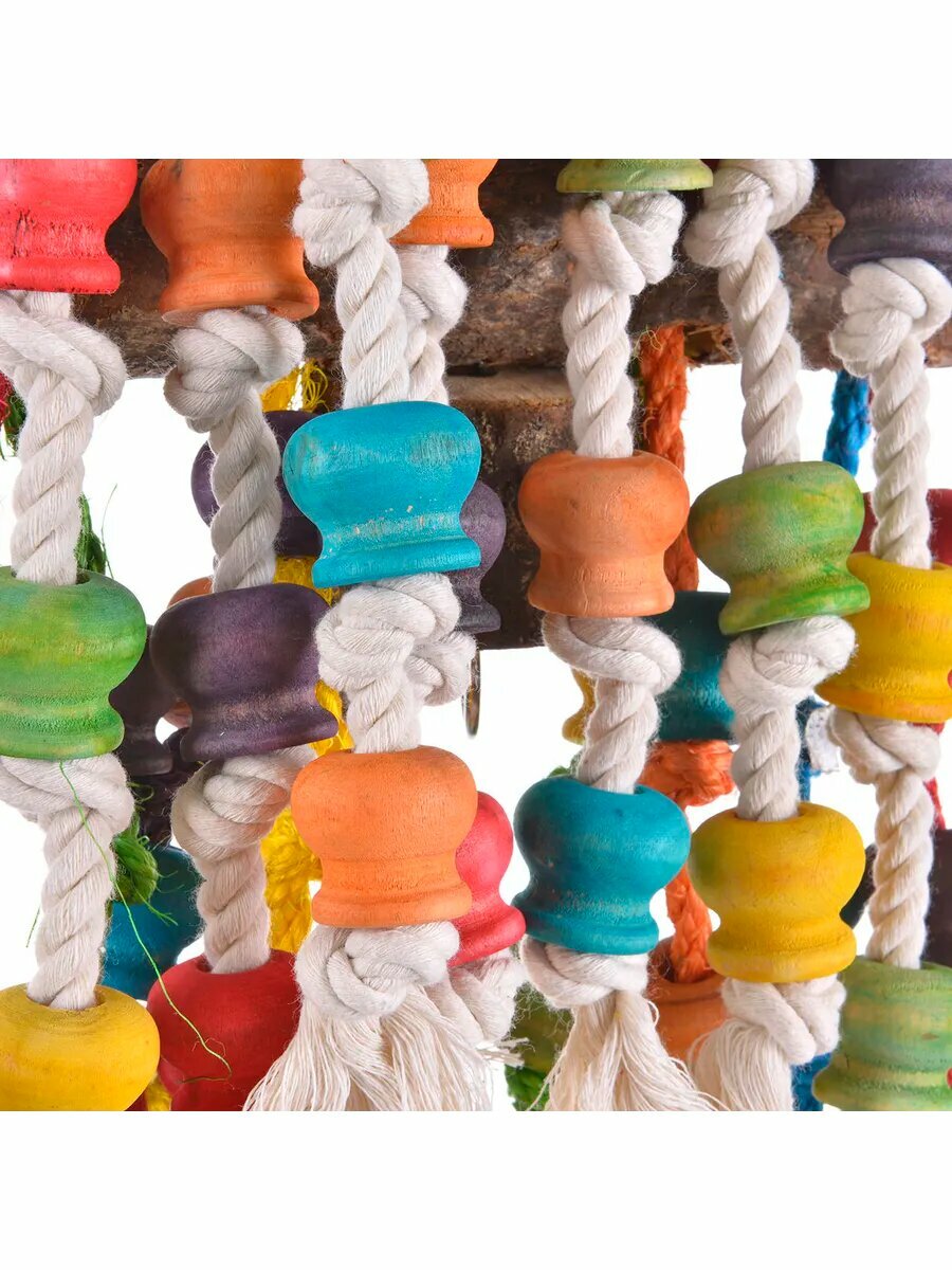 Гигантская игрушка для попугаев для разгрызания и раскалывания. Вся конструкция раскачивается вперед-назад, как только птица прикасается к ней. Это делает игру настоящим испытанием. Красочные большие деревянные бусины, нанизанные на несколько сизалевых и хлопковых веревок, делают этот аксессуар прекрасным украшением любой клетки. Крупные отрезки натуральных веток скреплены между собой шпильками из нержавеющей стали. Каждый деревянный элемент на веревочках закреплен отдельным узлом, а на конце каждой хлопковой веревки находится дополнительный узелок.