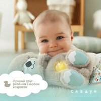 Мягкая музыкальная игрушка для сна с дыхательными движениями для новорожденных детей и старше 11 сенсорных открытий для органов зрения, слуха и осязания вашего малыша Настройка подсветки, музыки и звуков, регулятор громкости и до 30 минут воспроизведения Помогает выстроить здоровый режим сна и бодрствования Игрушку можно стирать в стиральной машине (необходимо извлечь блок питания)