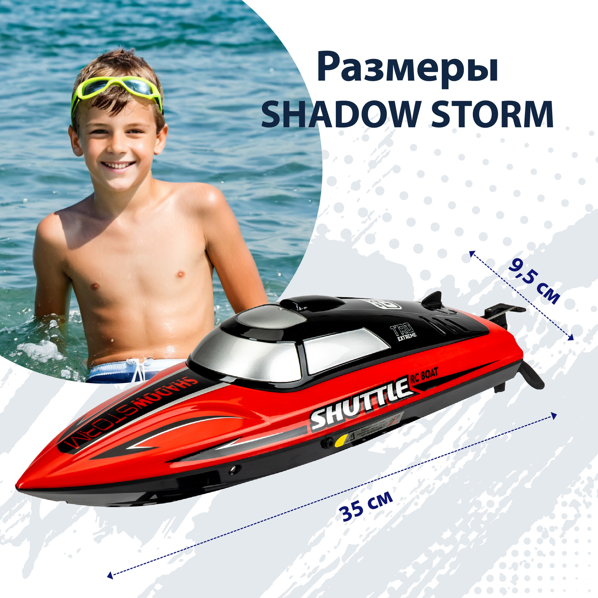 Гоночный катер на радиоуправлении NEWJEL SHADOW STORM с мощным мотором, быстрый и маневренный идеальный подарок для мальчика и папы. Быстрый катер развивает скорость до 25 км/ч, пульт управления имеет широкий радиус действия 80 метров и оснащен защитой от помех. При сильном отдалении моторная лодка подаст звуковой сигнал. Система водяного охлаждения защищает быстрый катер от износа и перегрева электронный мотор, как и вся конструкция, надёжно защищен от попадания воды. Продуманная конструкция защитит от переворачивания во время игры на воде и открытом воздухе. В качестве преимуществ можно выделить: наличие нескольких скоростей движения, задний ход, демо режим и управления тримерами для регулировки движения, все это позволяет поворачивать в разные стороны, совершать головокружительные маневры и уверенно держаться на воде как настоящей лодке.