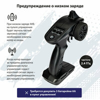 Игрушечный катер оснащён ёмким аккумулятором на 15 минут непрерывной игры и сигнализаций при низком заряде АКБ.