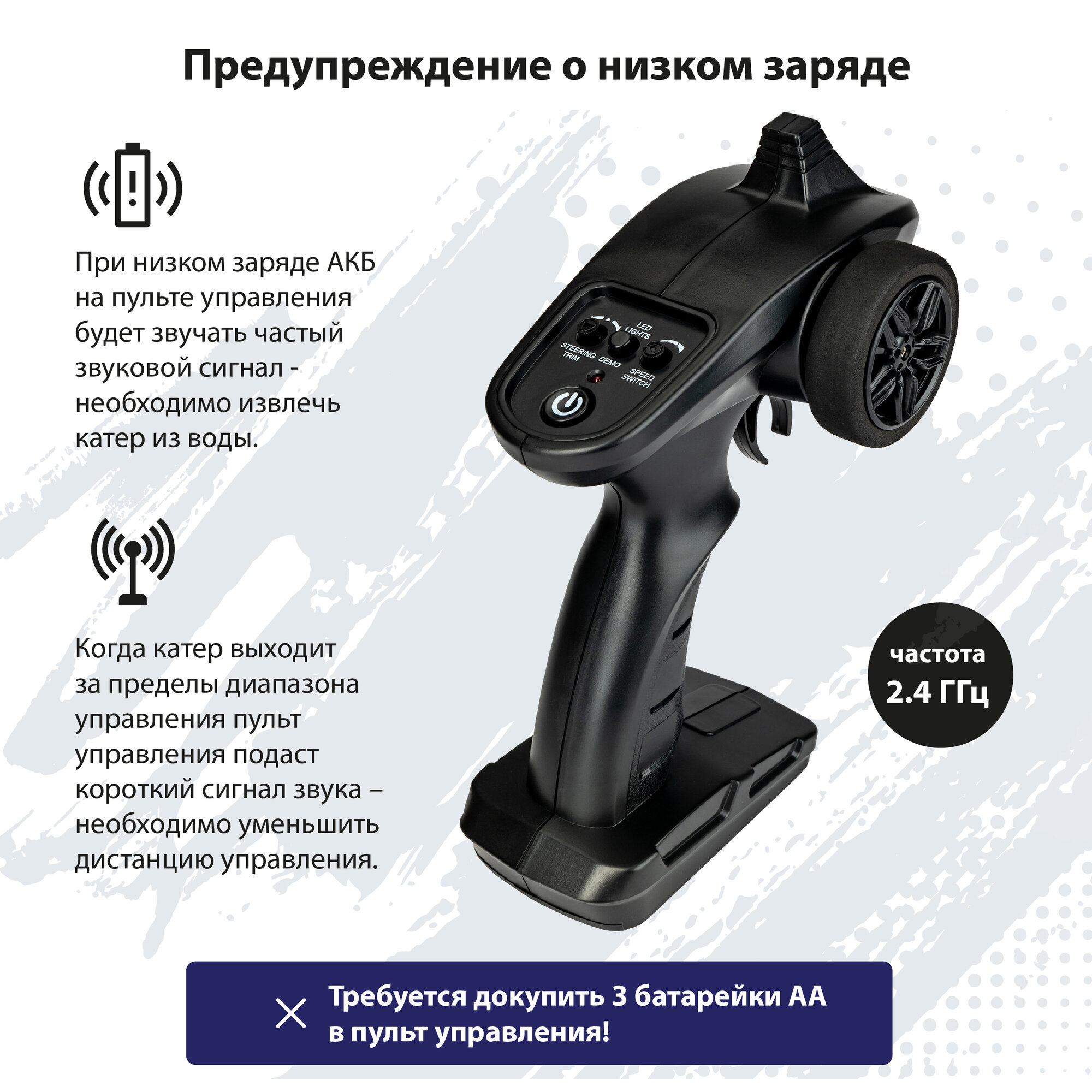 • Сигнализация о разряде АКБ и дальности действия пульта ДУ