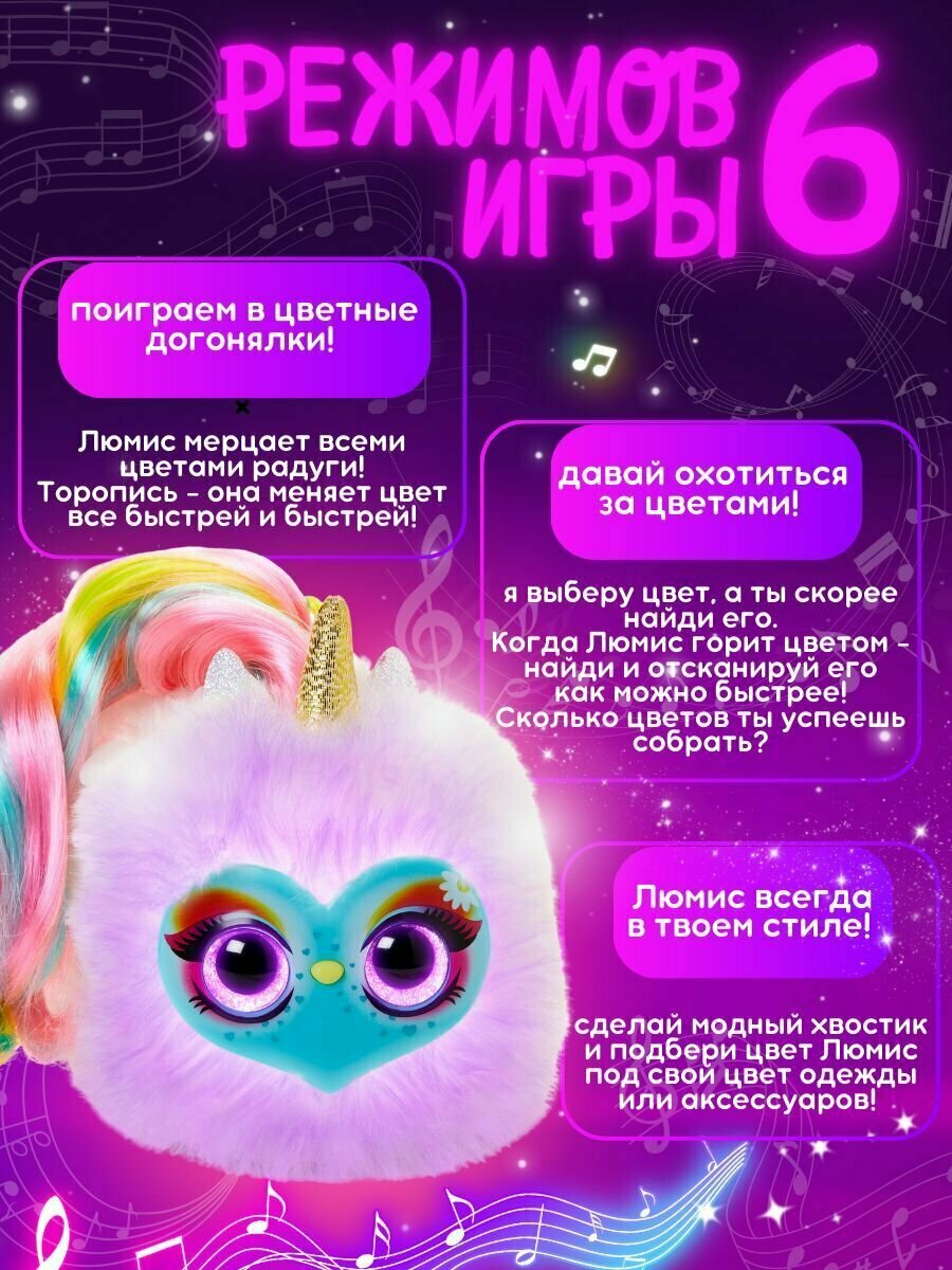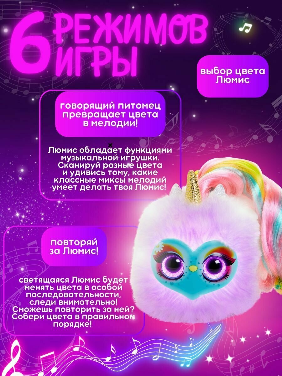 Но это ещё не всё! У игрушки есть специальный музыкальный режим, который превращает цвета в мелодии. Люмис даже может записывать мелодии! Игрушка полностью локализована на русский язык. Вы можете создать сотни комбинаций цветов и звуков!