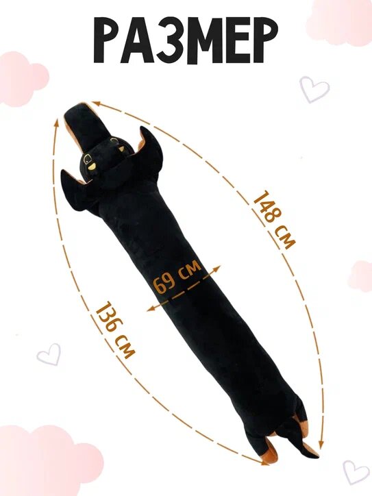 Мягкая игрушка в виде таксы длиной 140 см – это не просто плюшевая игрушка, а настоящий друг и компаньон для любого возраста. Эта большая мягкая игрушка обладает уникальным шармом и способна стать идеальным подарком на день рождения, Новый год или даже без повода.
