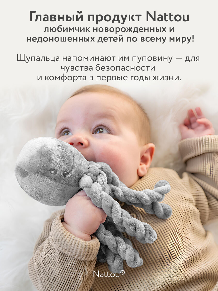удобный размер и сплетённые вручную ножки-щупальца, которые на ощупь напоминают пуповину в утробе матери – игрушка идеально подойдёт для новорождённых малышей