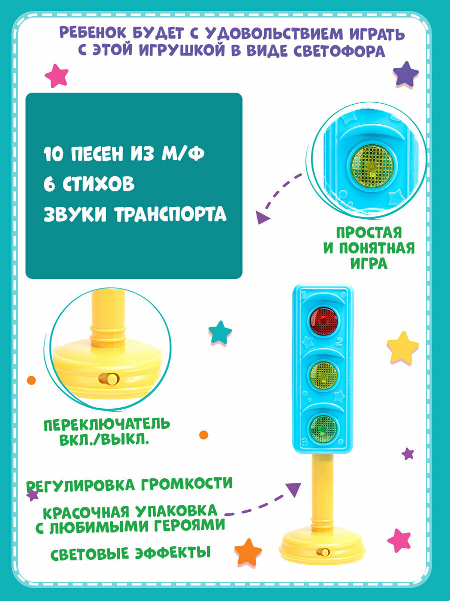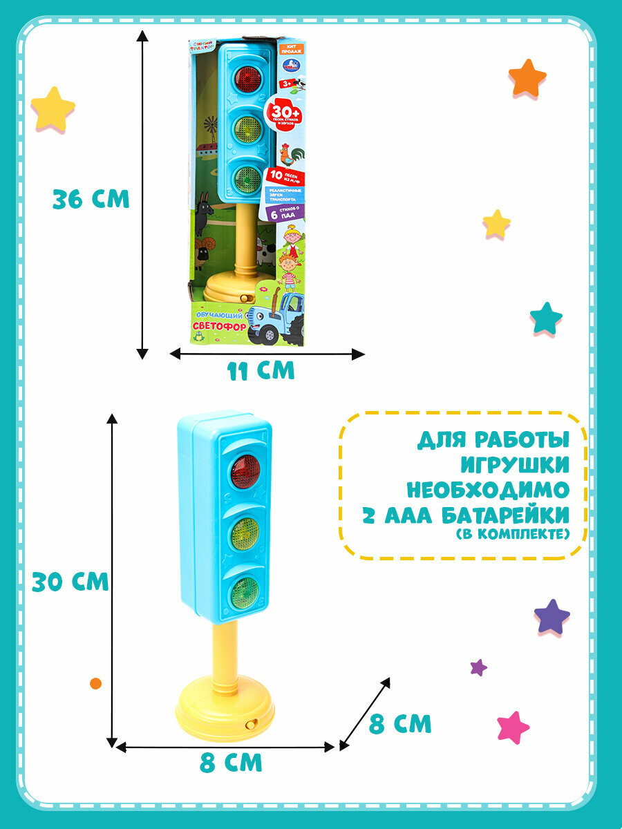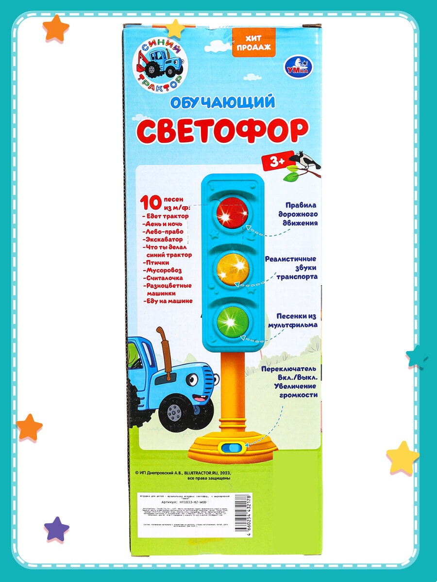 Обучающий светофор «Синий Трактор» ТМ «УМка» непременно понравится маленькому поклоннику мультсериала про весёлый трактор: - 30+ песен, стихов и звуков - 10 песен из м/ф (фрагменты): «Едет трактор», «День и ночь», «Лево-право», «Экскаватор», «Что ты делал, Синий Трактор?», «Птички», «Мусоровоз», «Считалочка», «Разноцветные машинки», «Еду на машине» - 6 стихов о правилах дорожного движения - реалистичные звуки транспорта - переключатель Вкл./Выкл. и регулировка громкости - красочная упаковка с любимыми героями Яркая и оригинальная игрушка в виде светофора сделает обучение малыша лёгким и интересным. Он с удовольствием будет слушать весёлые песенки, стихотворения про ПДД и звуки транспорта. В увлекательной игровой форме ребёнку будет легко выучить правила дорожного движения и сигналы светофора. Компактную игрушку удобно брать с собой. Игра с обучающим светофором ТМ «УМка» развивает: - память - слуховое восприятие и музыкальный слух - тактильные навыки - визуальное восприятие - моторику Размер: 8 x 30 x 8 см. Материал: пластмасса. Работает от 2-х батареек типа ААА (в комплекте). Рекомендовано детям от 3-х лет.