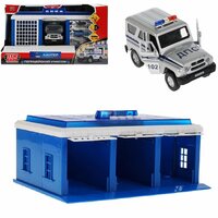 Комплектация: - гараж Полицейский участок 23 х 16.5 х 11 см, - металлическая машина полиция УАЗ хантер 11.5 х 5.8 х 5.5 см.