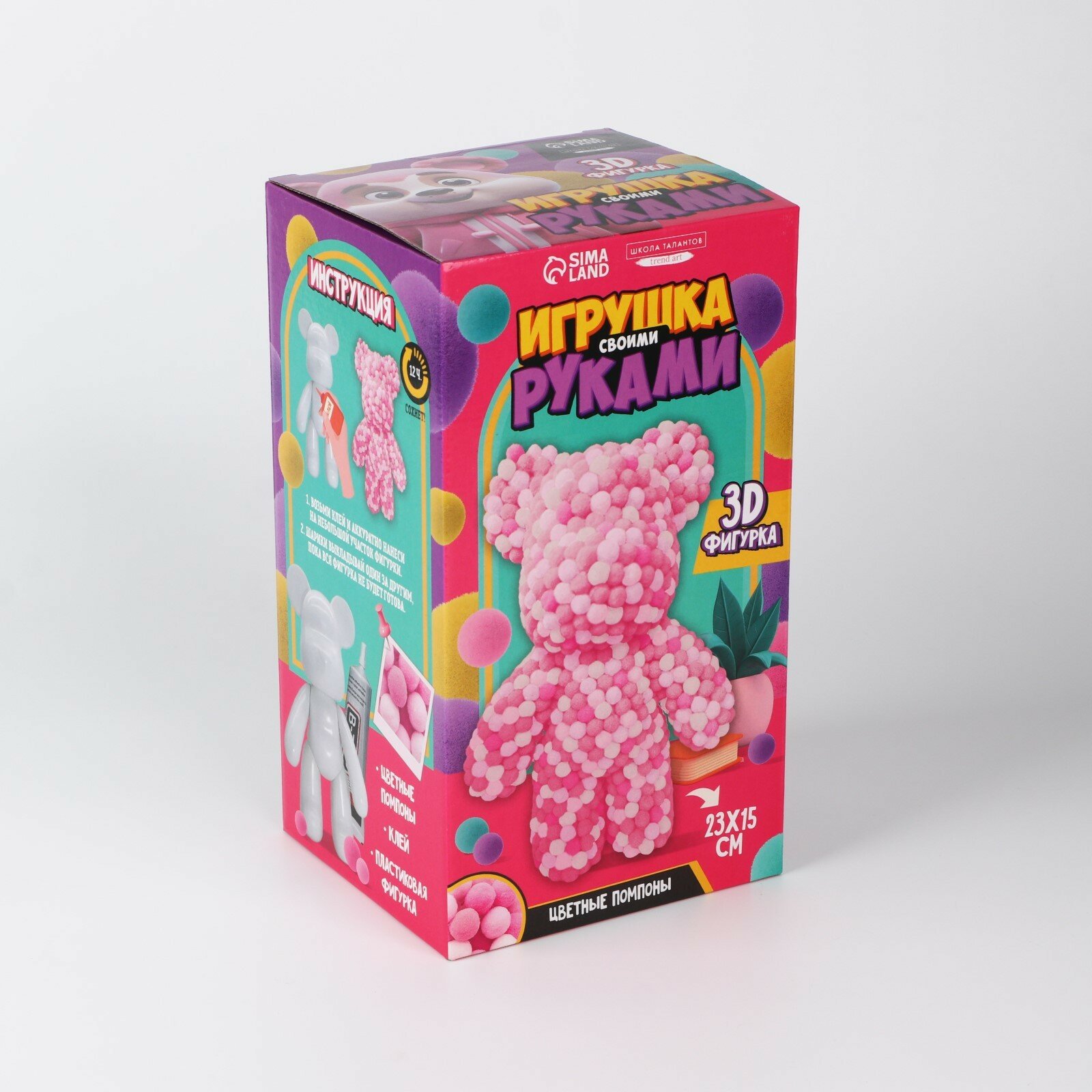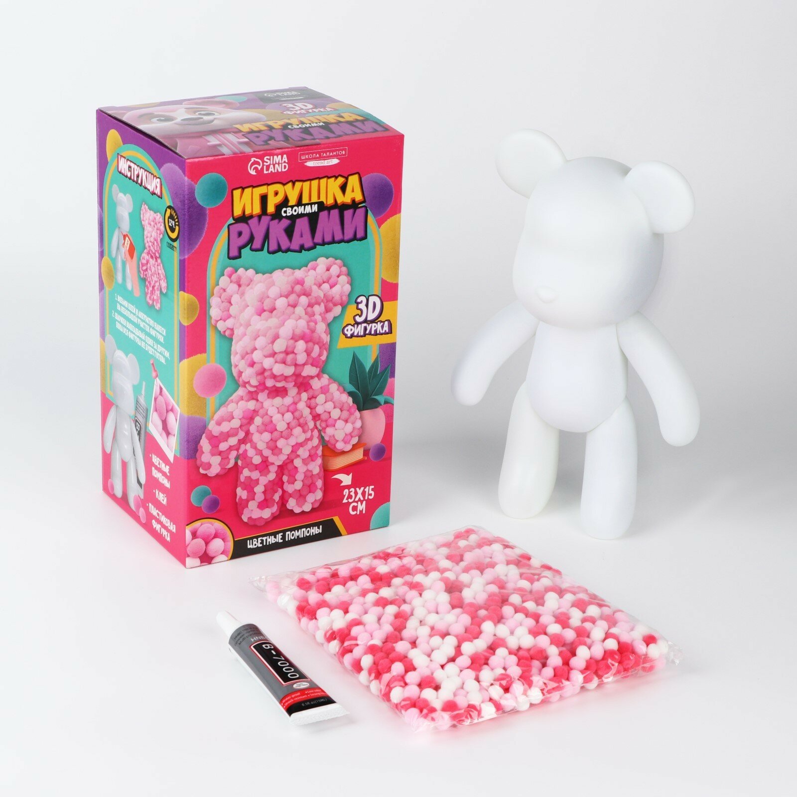Для декорирования фигурки рекомендуем использовать клеевой пистолет Создайте эксклюзивную игрушку своими руками! Набор позволит ребёнку своими руками смастерить игрушку из помпонов. Малышу понравится не только результат работы, но и сам творческий процесс. Увлекательное занятие поможет развить мелкую моторику рук, усидчивость, внимательность и аккуратность. В набор входит: фигурка помпоны клей Наслаждайтесь счастливыми моментами творчества вместе с детьми! Дополнительно Внимание! Возможны небольшие заломы на крышке коробки.