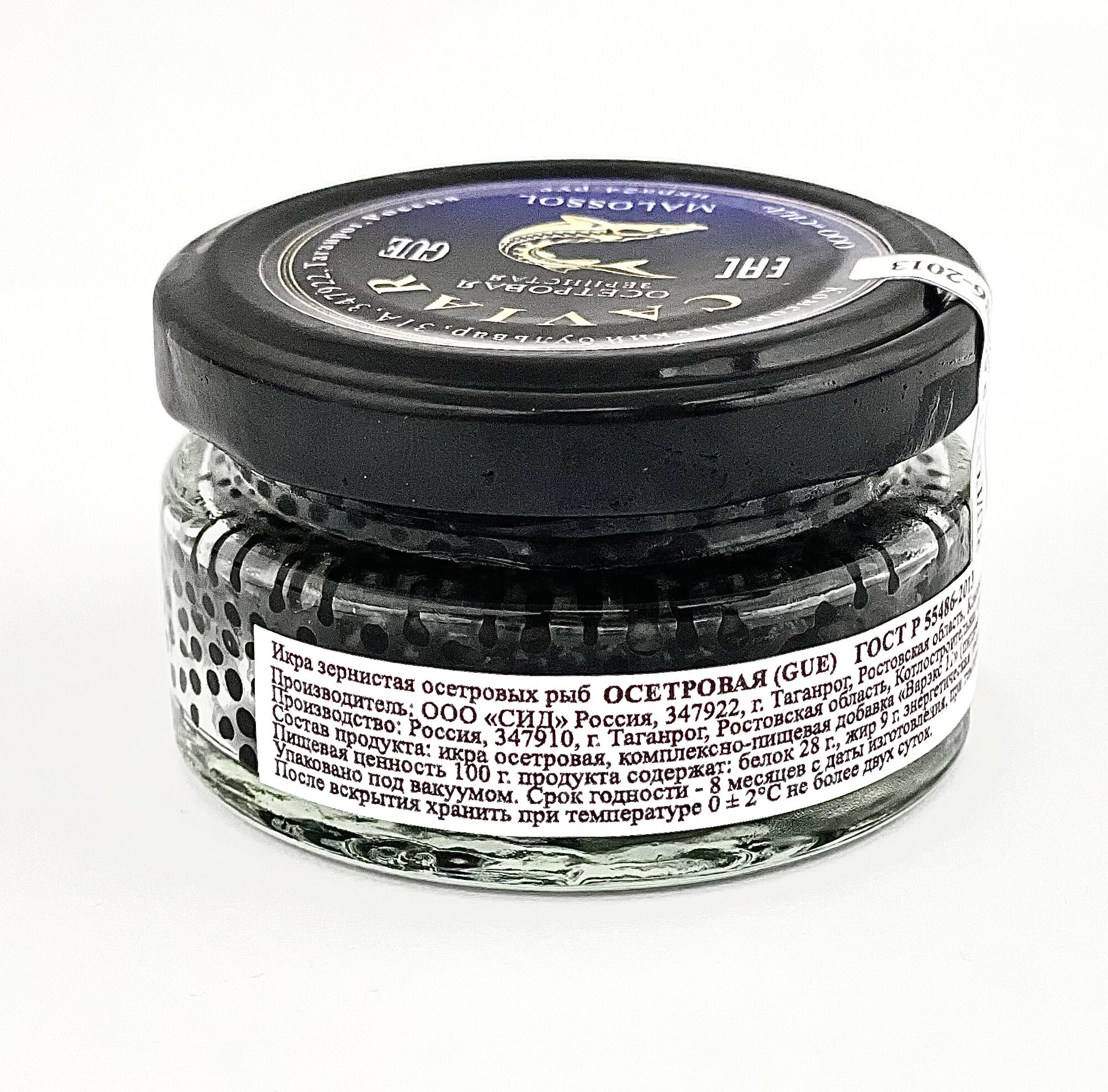 Икра осетровая зернистая малосольная. - Диаметр икринок: От 2,0 до 3,0 мм. - Цвет: Тёмно-серый до чёрного. - Способ производства: Сухой засол свежей икры, не подвергавшейся замораживанию. - Упаковка: Стеклянные банки с вакуумированными крышками. - Место производства: г. Таганрог, Ростовская область. - Производитель: ООО «СИД». ▌ Преимущества продукта: - Соответствие российскому государственному стандарту качества ГОСТ Р 55486-2013. - Натуральность и экологичность (не используется замороженное сырьё). - Полезность для здоровья (способствует повышению уровня гемоглобина). - Сертифицирован, прошёл ветеринарные проверки и зарегистрирован в системе маркировки «Честный знак». Представленная продукция обладает высоким качеством, соответствует требованиям стандартов и является экологически чистым продуктом, полезным для всех категорий потребителей.