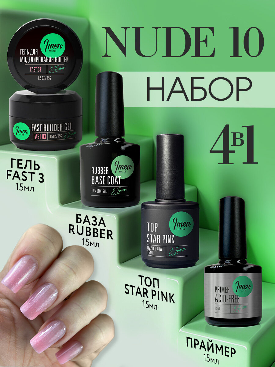 Купить Imen Набор «Nude 10 Тонкие и прочные» ( бескислотный праймер, каучуковая база, жидкий гель, розовый топ с шиммером) с доставкой по всей России.
