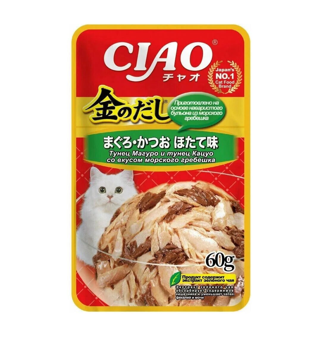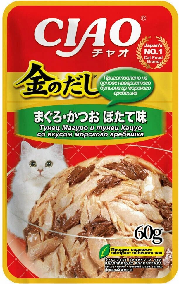 Суперпремиальный влажный корм для кошек Kinnodashi от японского производителя Inaba приготовлен на основе нежных кусочков мяса двух разных видов глубоководного тунца с морским гребешком в аппетитном насыщенном бульоне золотистого цвета.