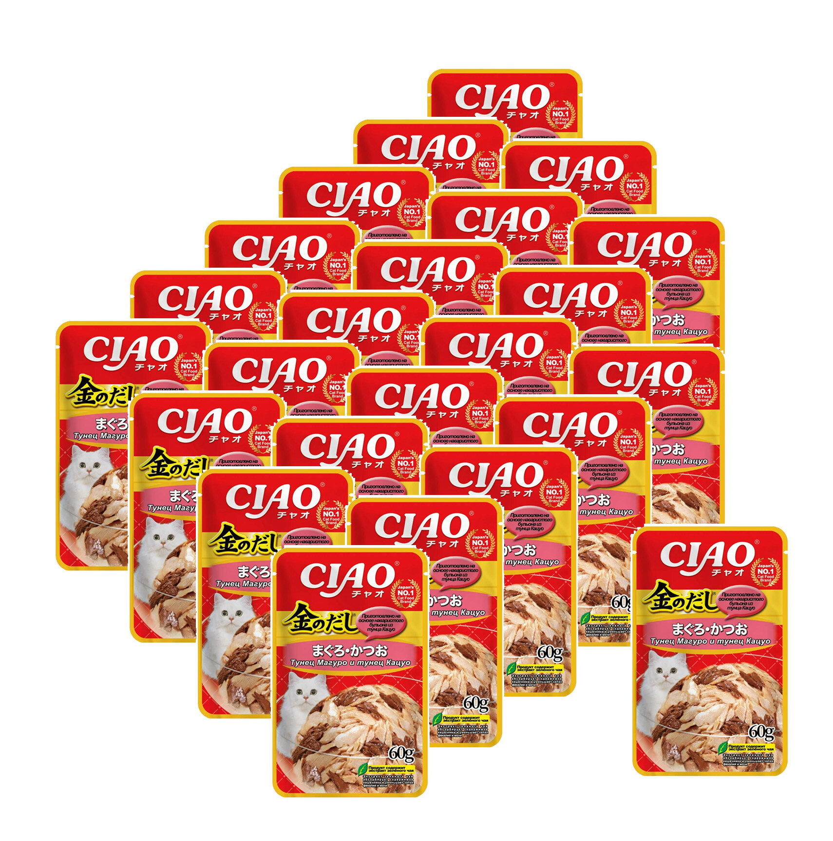 Суперпремиальный влажный корм для кошек Kinnodashi от японского производителя Inaba приготовлен на основе нежных кусочков мяса двух разных видов глубоководного тунца с добавлением палтуса в аппетитном насыщенном бульоне золотистого цвета.